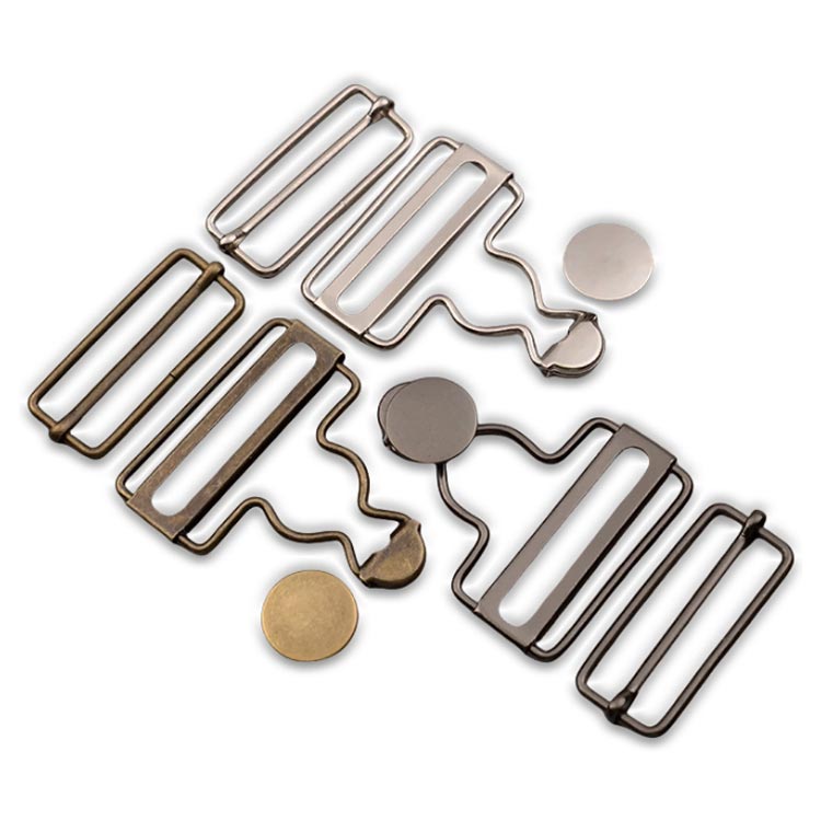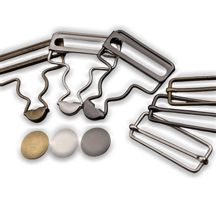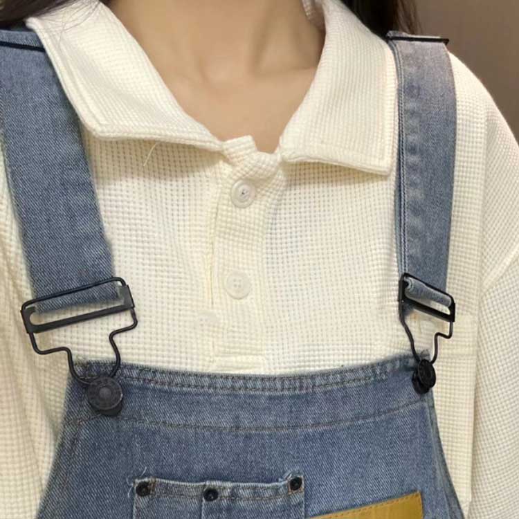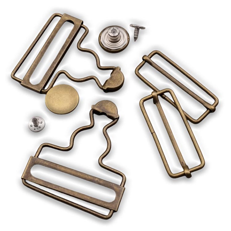 オーバーオールやサロペットなどの肩ひも調節にお使いいただける、タックボタンと移動カンがセットになった吊りカンです。