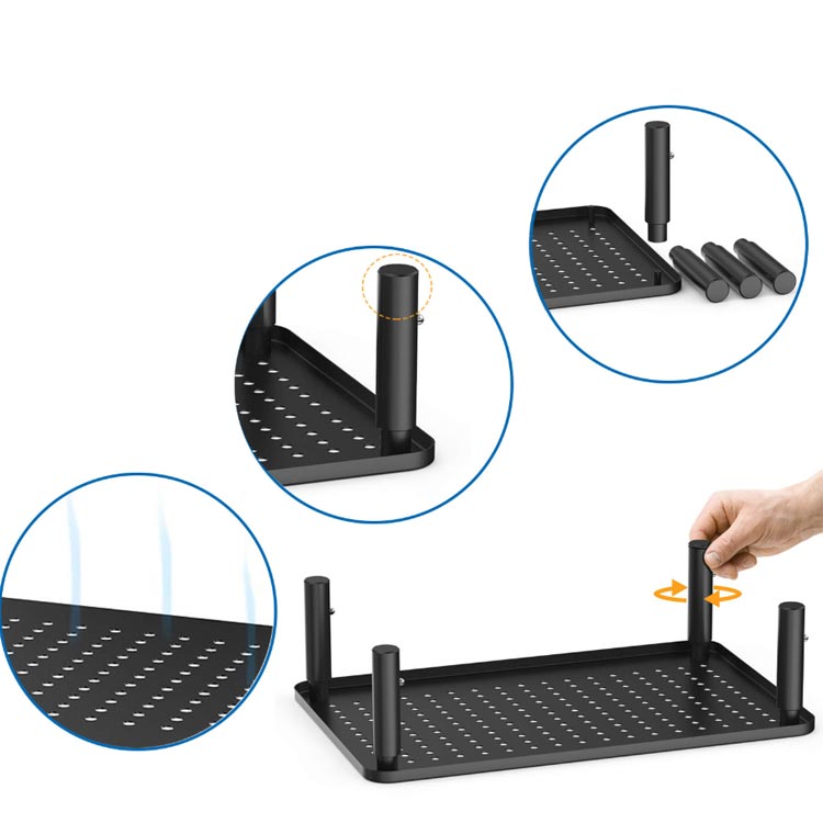 頑丈なスチール製です。耐荷重20kgで、しっかり物を支えます。ゴム脚なので、設置面を傷つけません。
