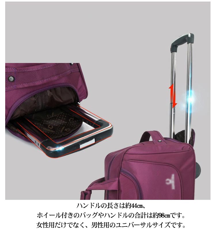 ハンドルの長さは約44cm、ホイール付きのバッグやハンドルの合計は約98cmです。女性用だけでなく、男性用のユニバーサルサイズです。