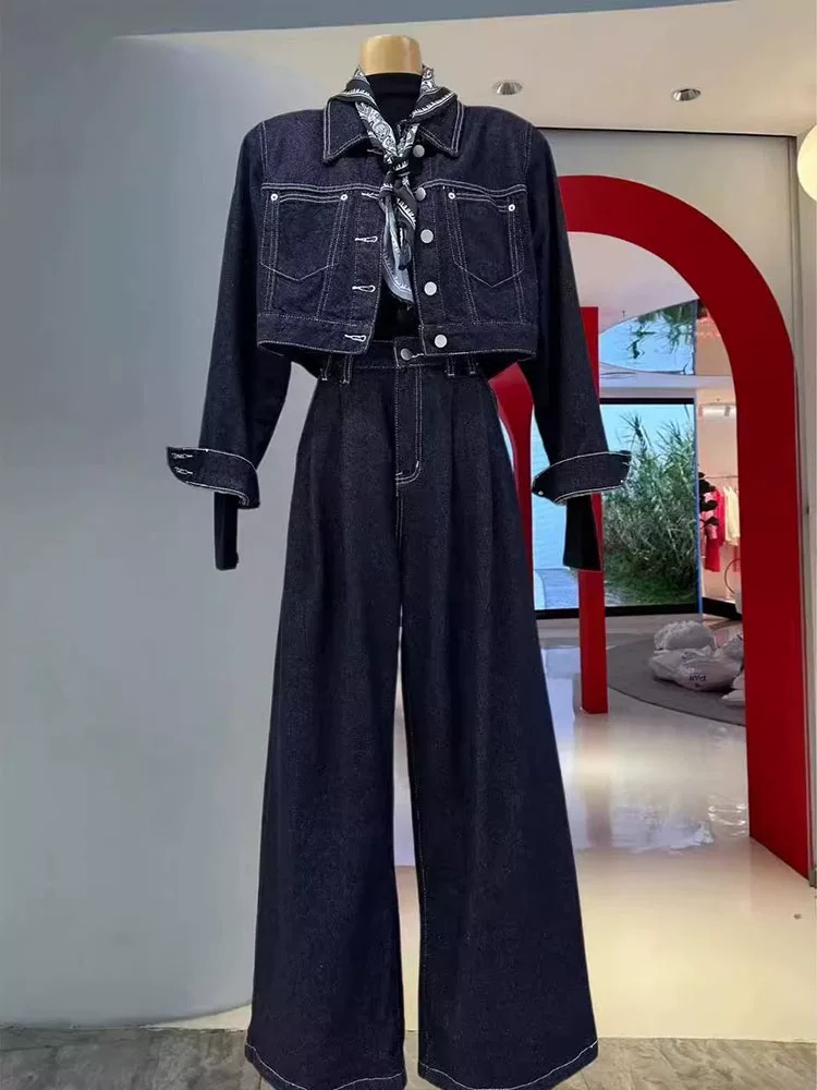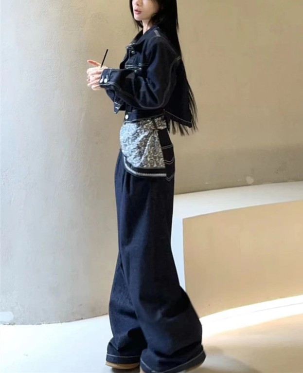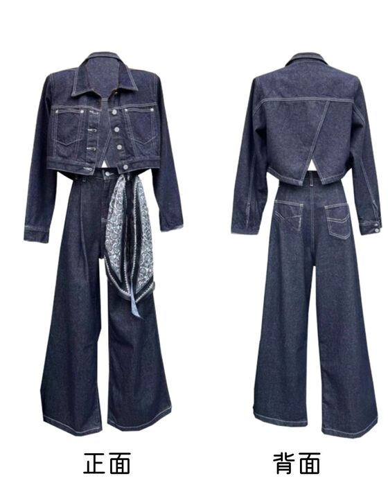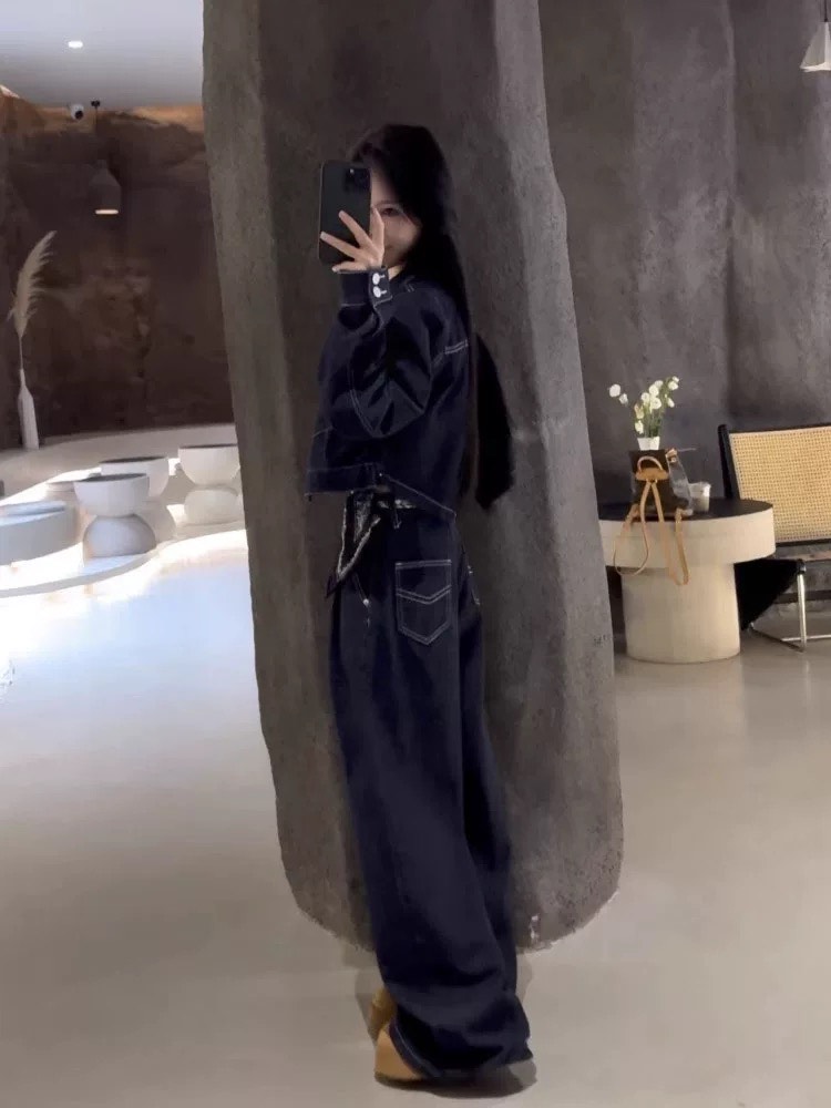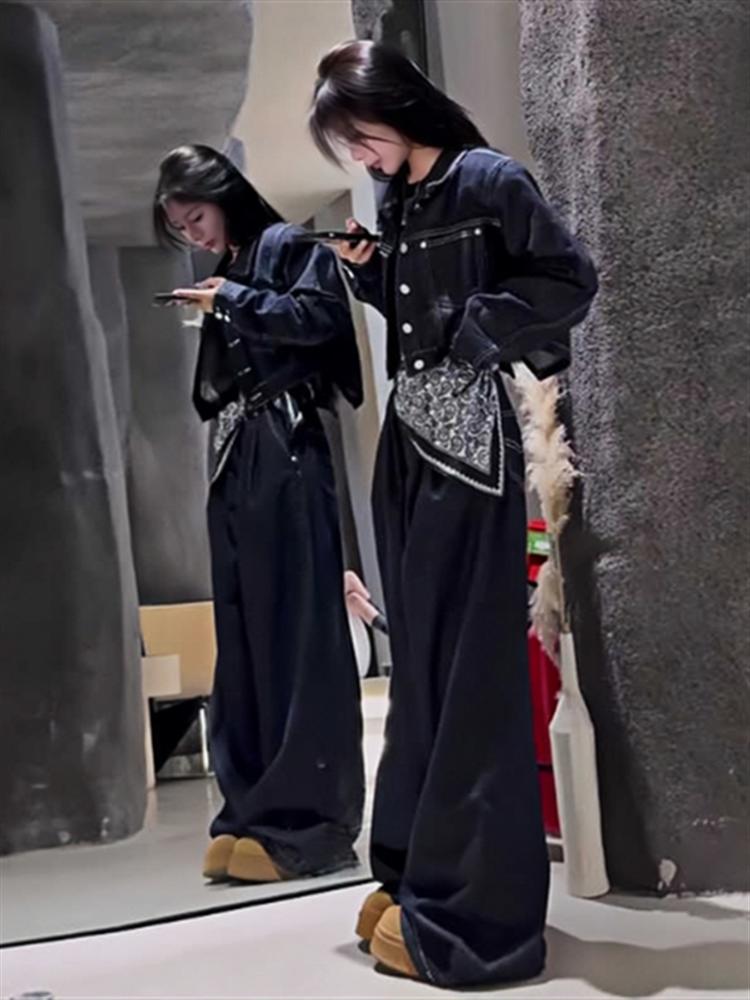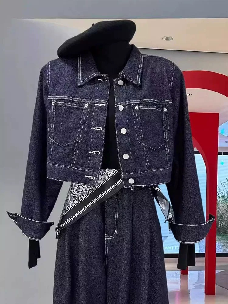 デニムセットアップ レディース セットアップ ショート デニムジャケット バックスリット ワイドパンツ 上下セット スカーフ付き インディゴカラー 韓国ストリート 新作 20代 30 韓国
