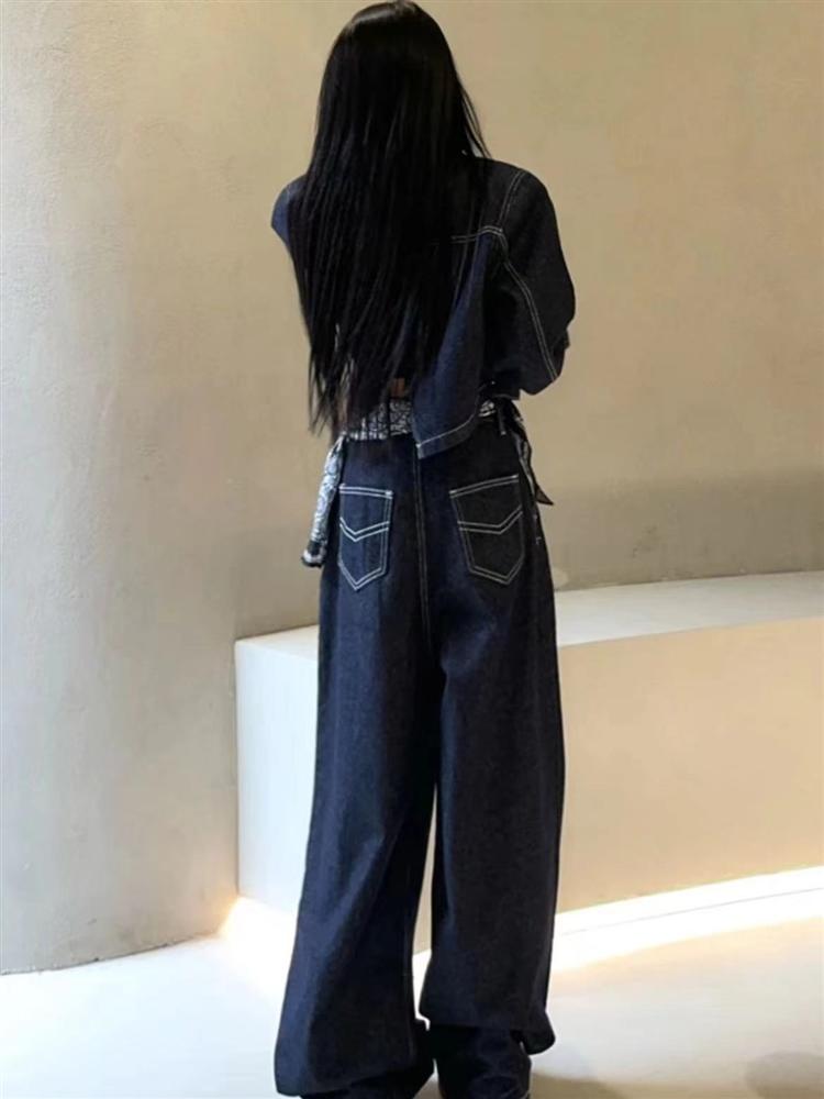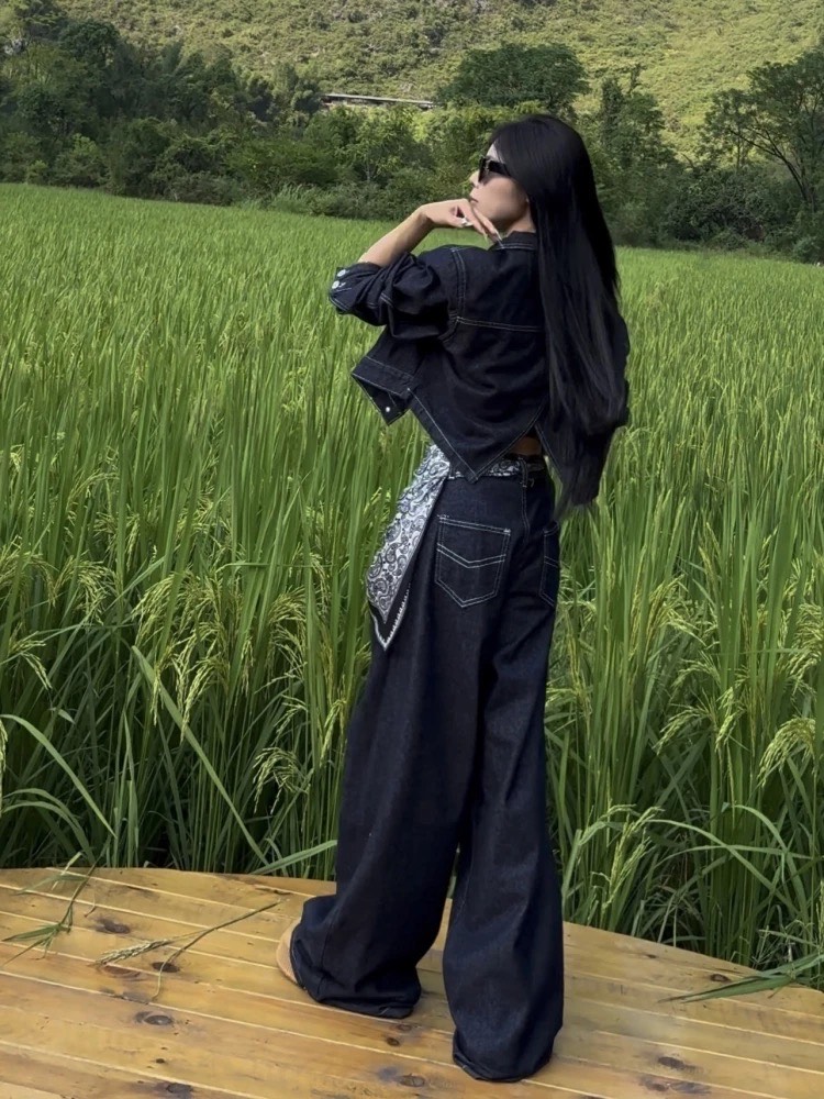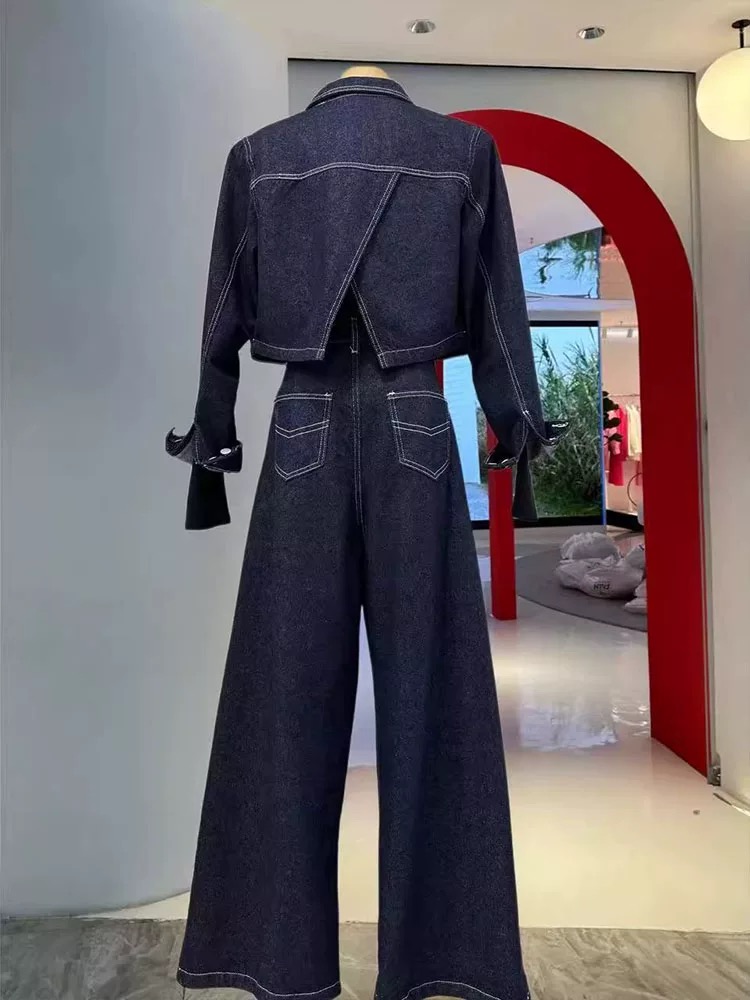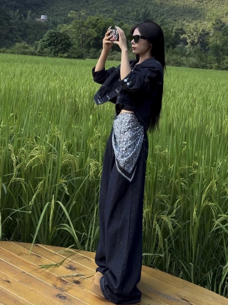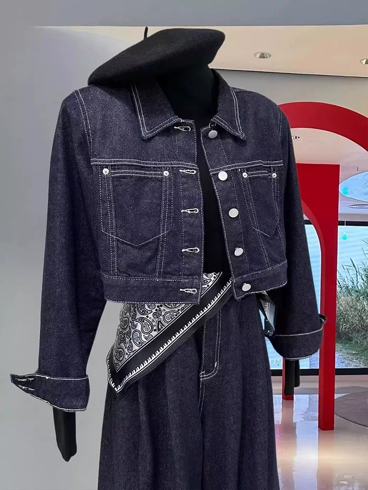 デニムセットアップ レディース セットアップ ショート デニムジャケット バックスリット ワイドパンツ 上下セット スカーフ付き インディゴカラー 韓国ストリート 新作 20代 30 韓国