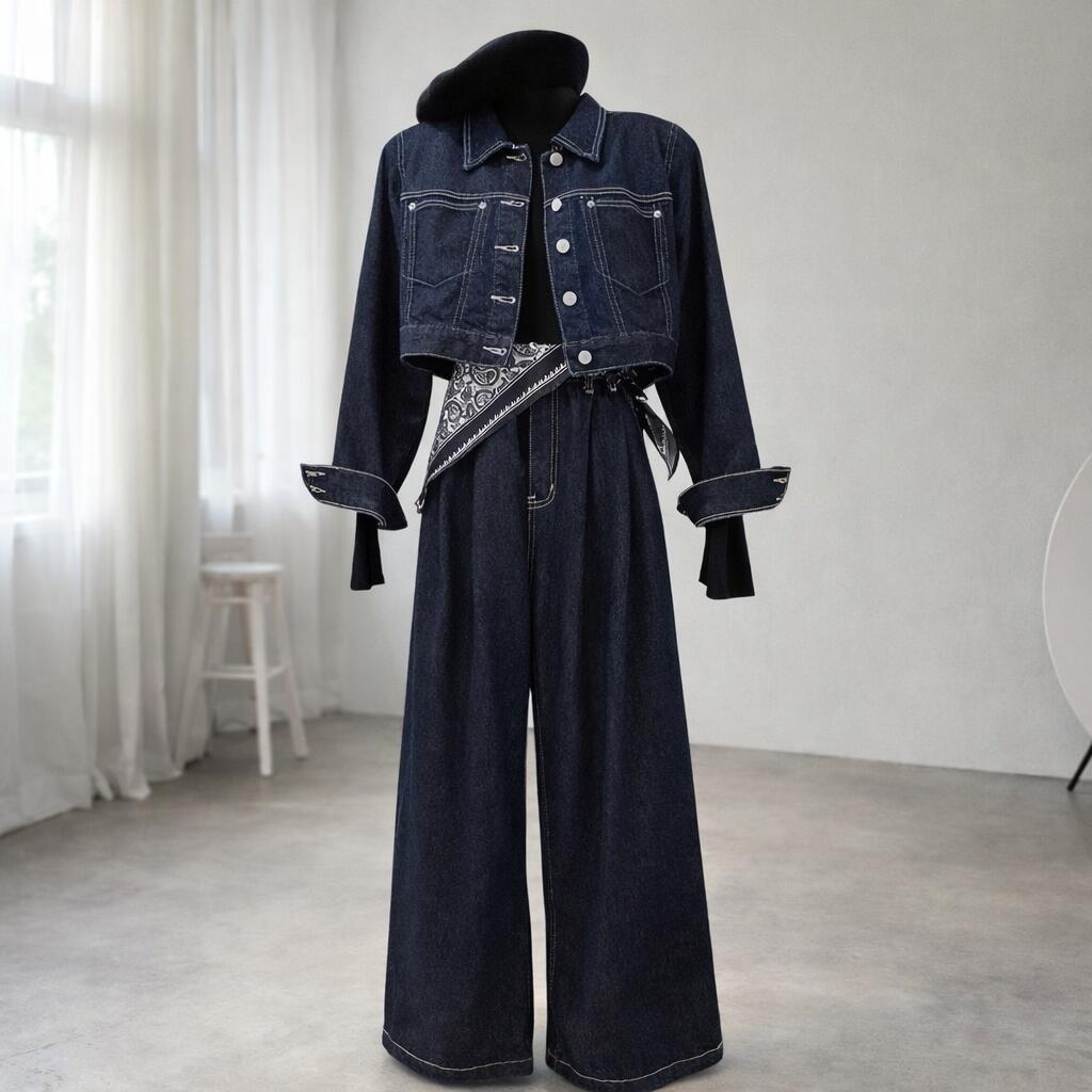 セットアップ ショートデニムジャケット ワイドパンツ 上下セット スカーフ付き