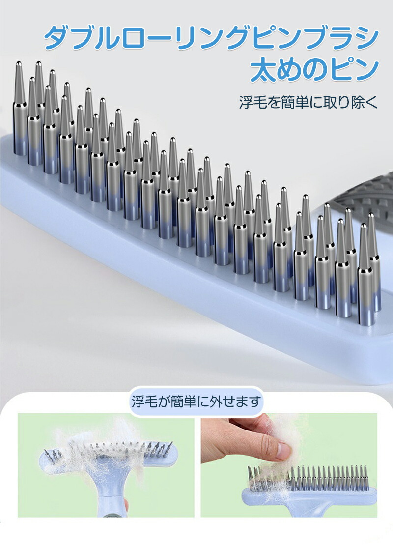 【適用対象と場合】中毛~長毛犬、中毛~長毛猫など、犬猫通用のペット用ブラシです。トリートメント、マッ サージ、抜け毛取り、シャワーなど、様々なシーンで大活躍してくれます。換毛期に毎日使えば、お洋服に付いた抜 け毛やお部屋に散らばった抜け毛が大幅削減できます、掃除にも便利です