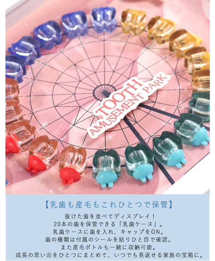 F 23*27cmセット内容:本体+歯入れケース×20、歯入れ蓋×20、綿 x 1、ピンセットx 1本、ミニボトルx 1本、記録シールx 2枚、リボンx 1※サイズ表の実寸法は商品によって1-3cm程度の誤差がある場合がございます。