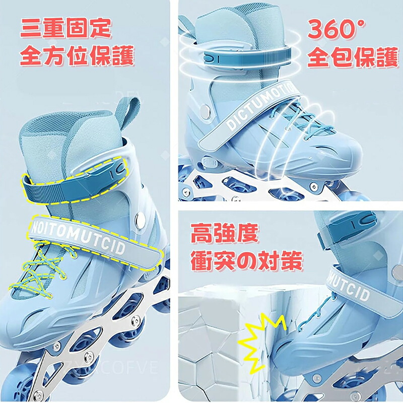 【360°全包保護】インラインスケートの表面高強度衝突の対策を講じ、衝撃吸収材を使用し、振動を吸収し、安定感があります。360°保護され、高硬度の筐体と厚いステント設計で、荷重力が強く、子供が足をくじいにくいです。