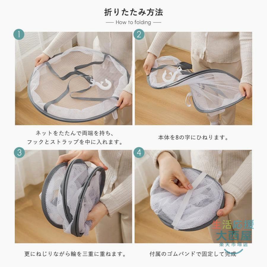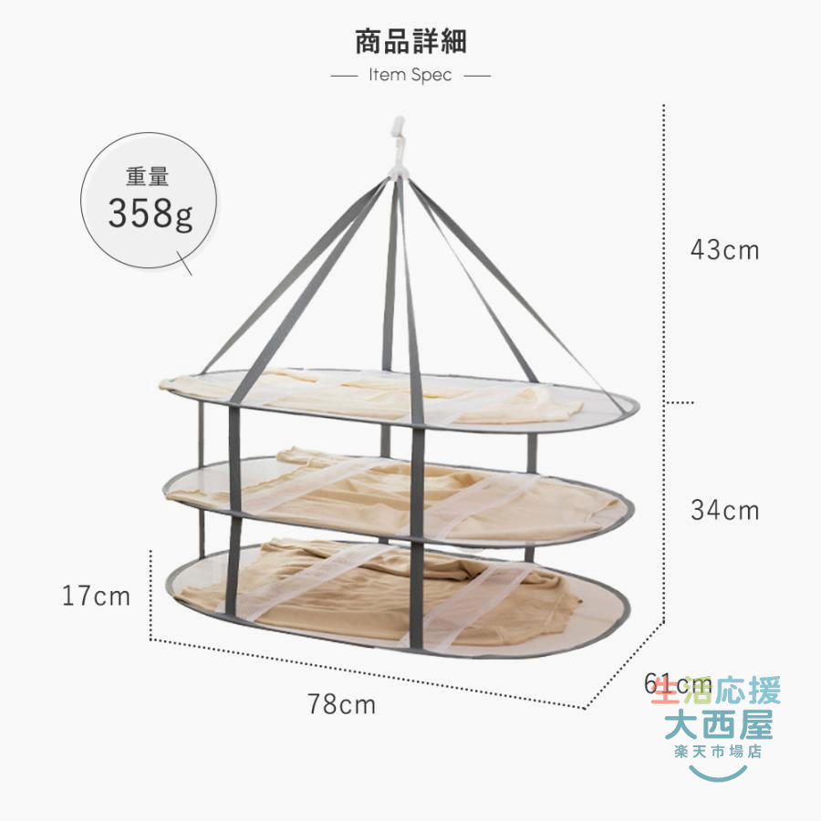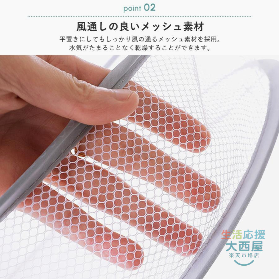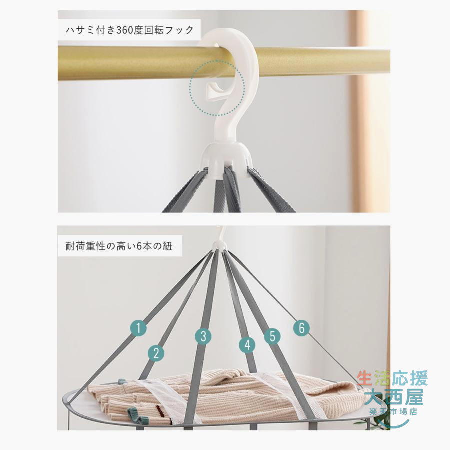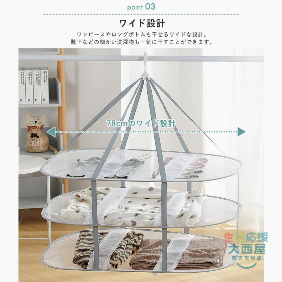 防風デザインの付きし易いフックと2箇所の幅広い滑り止め付き。メッシュ素材なので乾きにくい衣類でも心配不要。3段平干しネットで一気に干せます