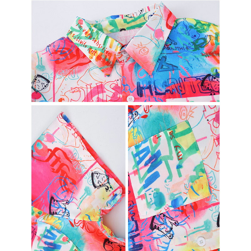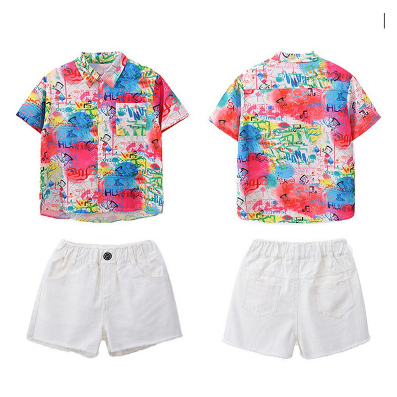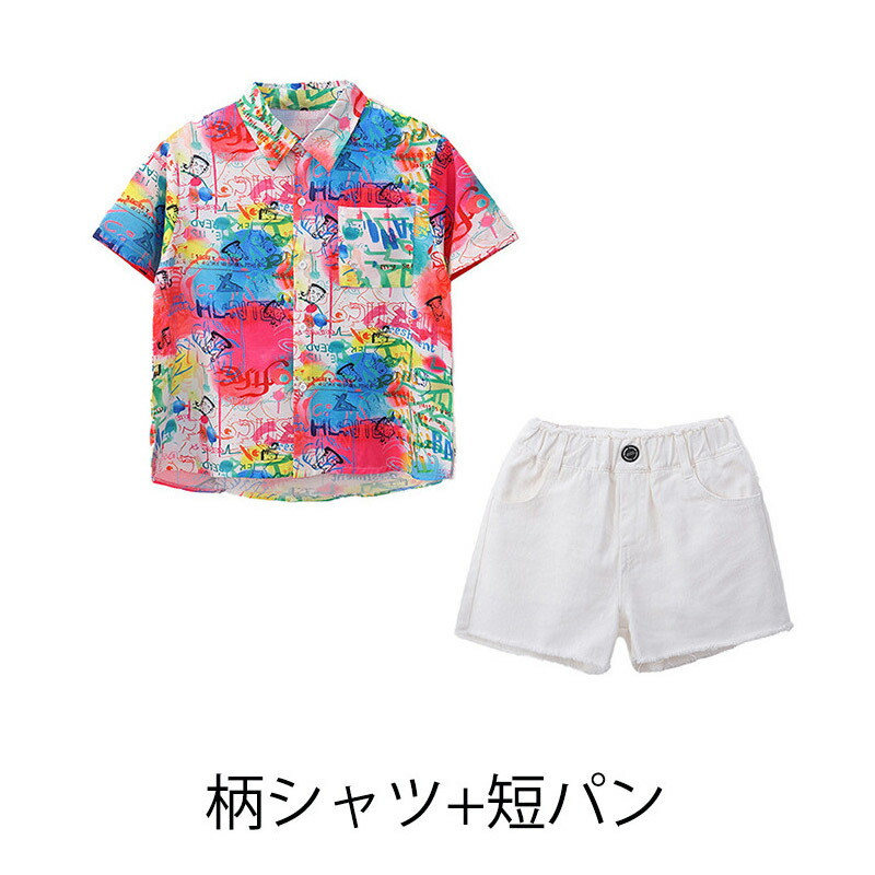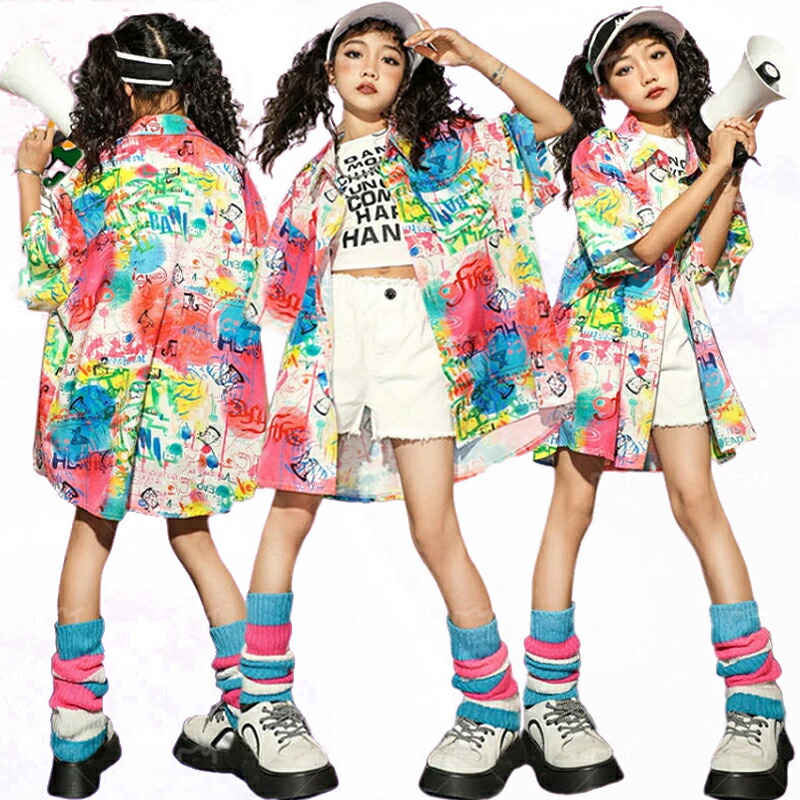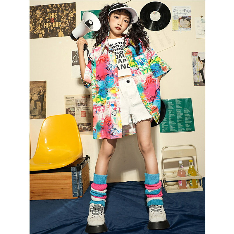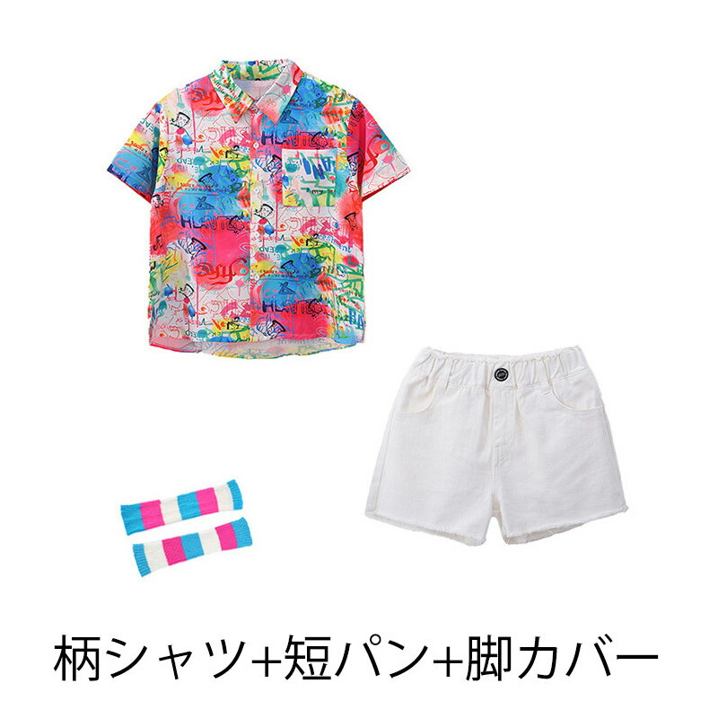 チア チアガール 韓国 k-pop 総柄 虹色 柄シャツ キッズ ダンス衣装 セットアップ おしゃれ 半袖 カジュアルシャツ トップス シャツ 女の子 かわいい jazz 演出服 かっこいい