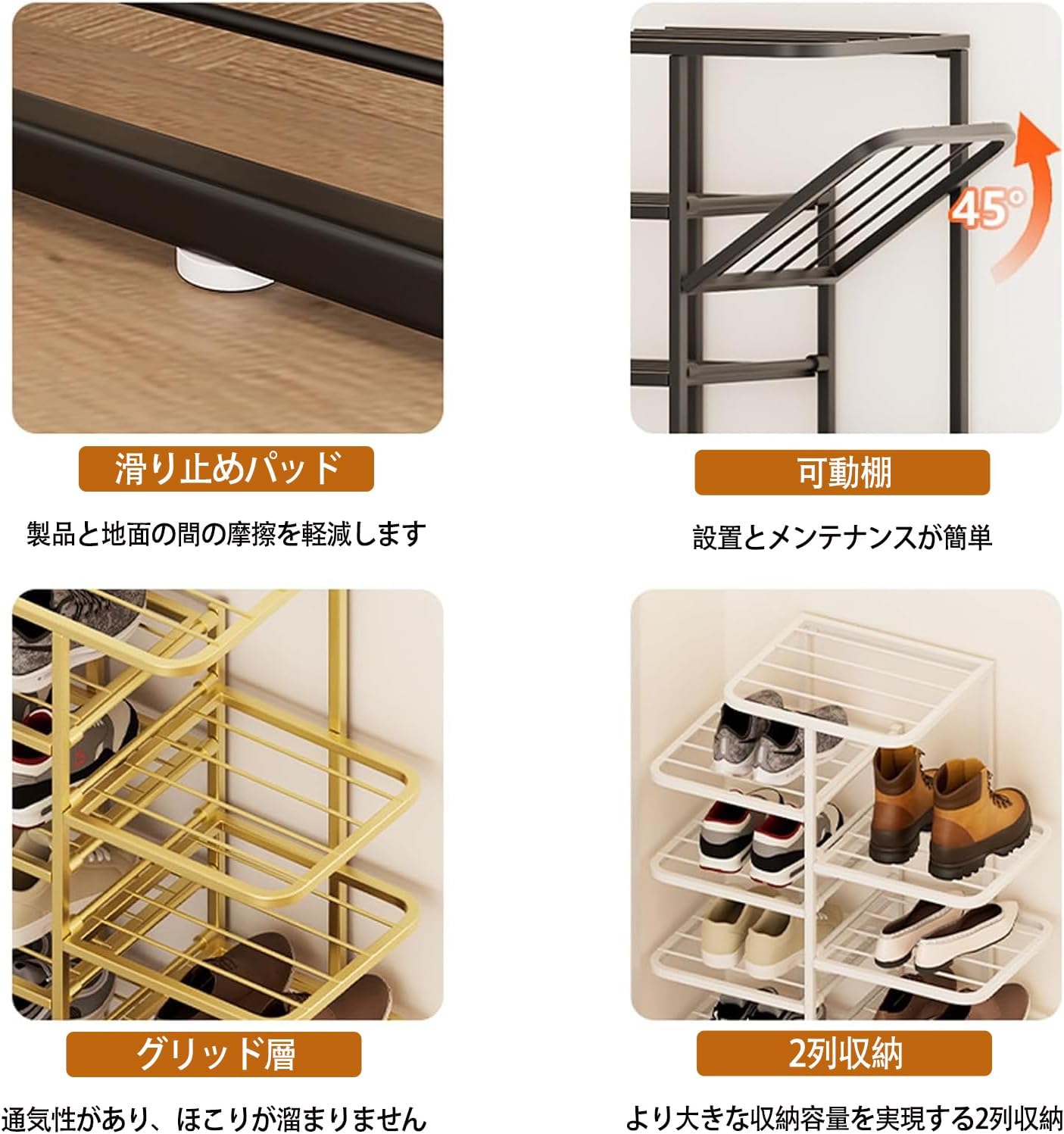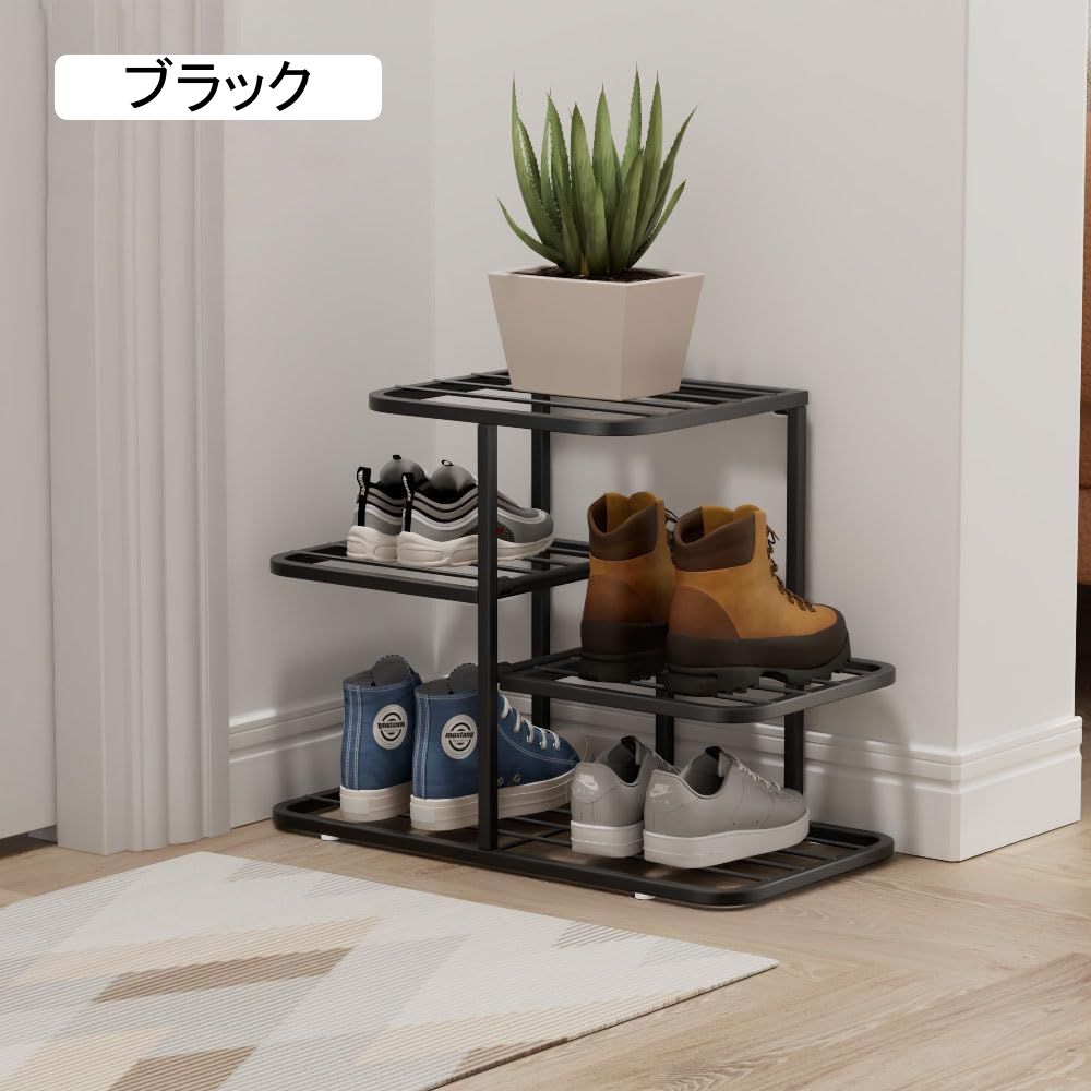繊細な金属の質感】靴ラックは全体的に金属光沢があり、シンプルで豪華です。耐候性を高めるため、ニス塗装を仕上げており、カビに強い、長くお使いいただけます。ちょっとした汚れは雑巾で拭けさるのでお手入れやすいです。