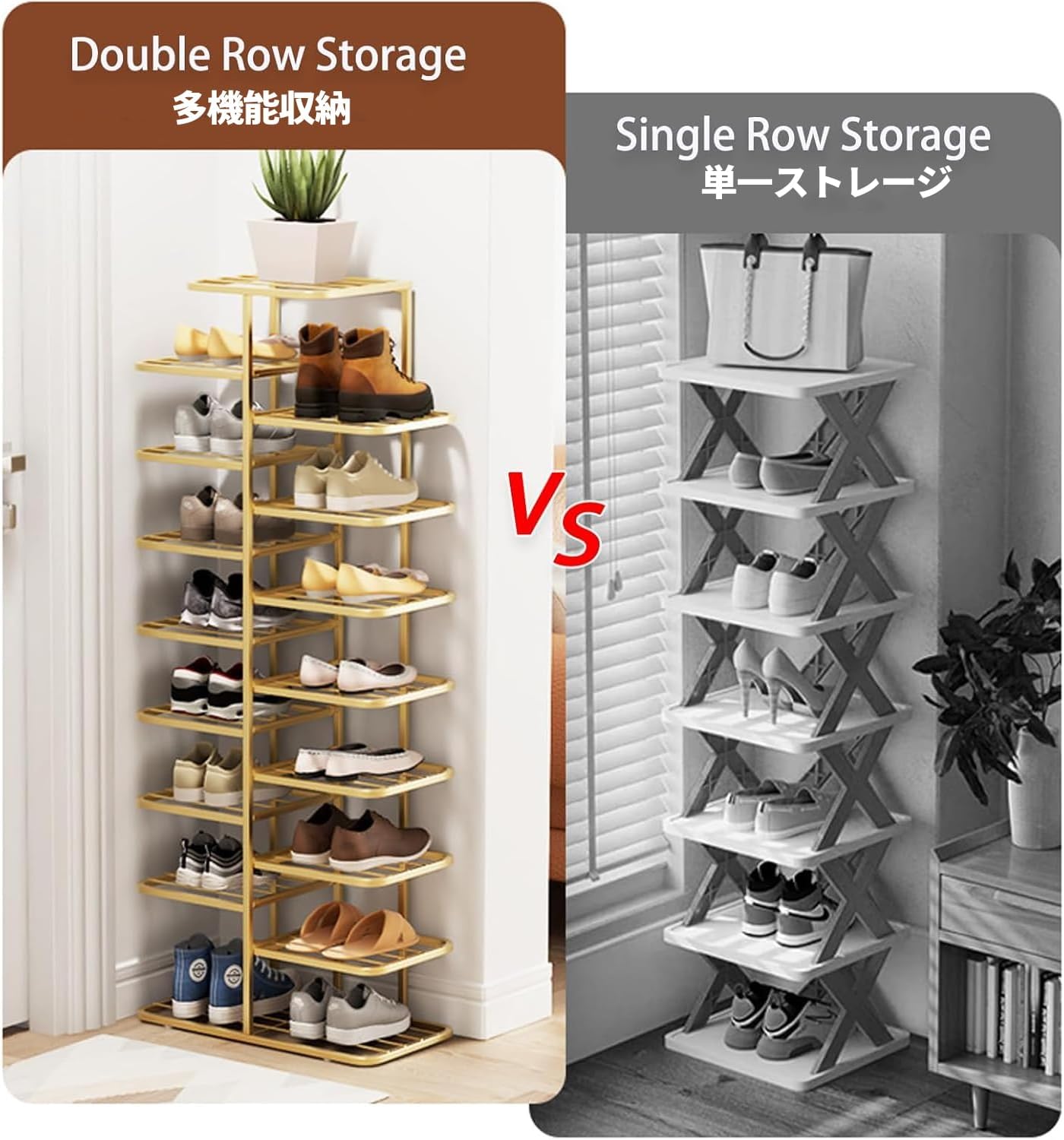 【2列縦型シューズラック】2列縦型デザインを採用。省スペースで、より多くのアイテムを収納・整理できます。また、異なるゾーンに分かれたデザインは、様々な高さの靴やブーツに適しており、あらゆる靴やブーツの収納ニーズを満たす、非常に便利で機能的なラックです。