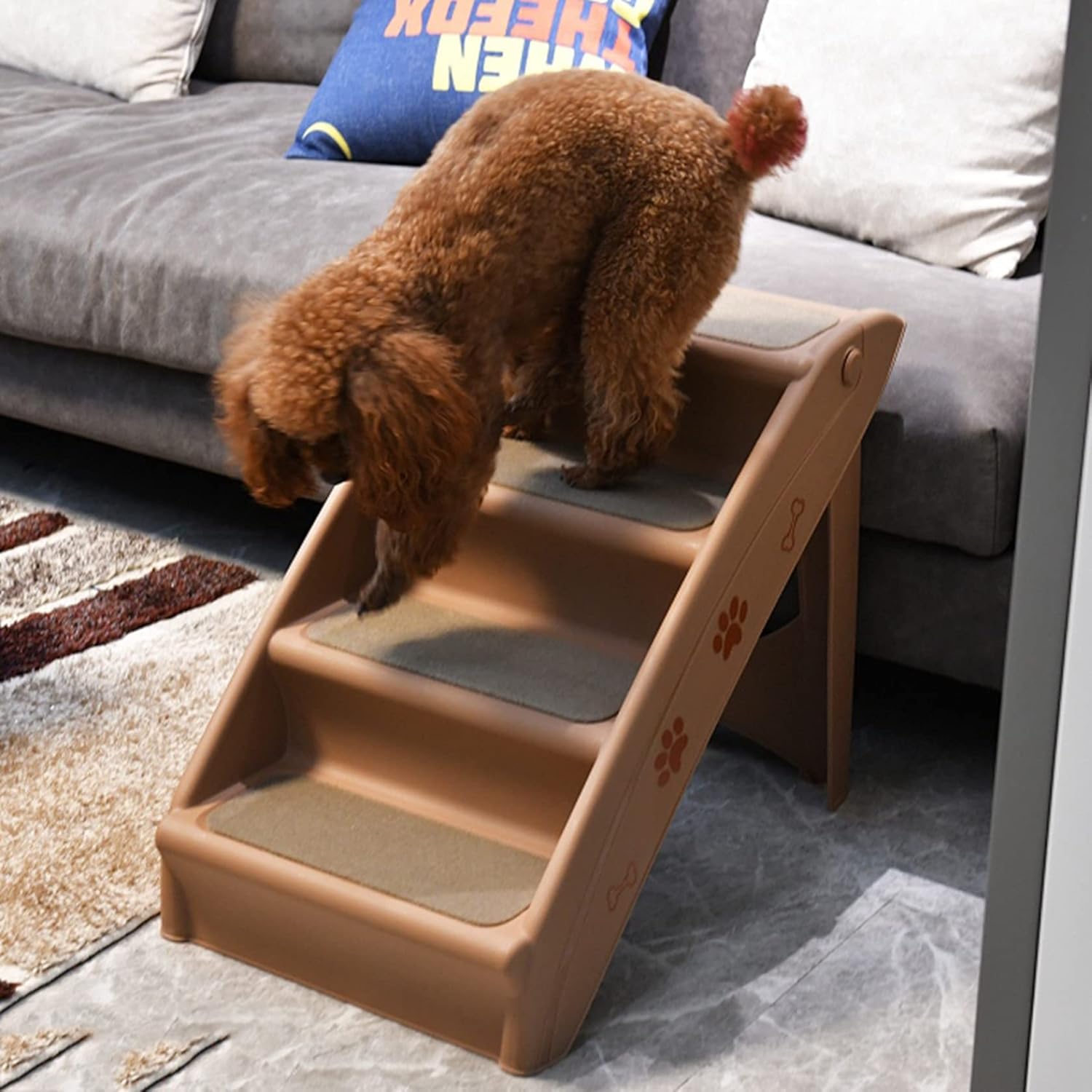 【子犬と老犬に似合う】超小型犬・子犬と行動不便の老犬におすすめの小さめ階段です。ベッドやソファーなどの脇に置き、ペットの上り降りをサポートします。スリムなので場所を取りません。