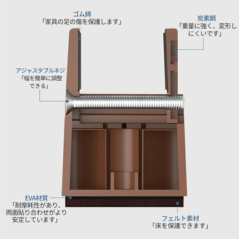 【エコパッド】 このフットマットの底部にはフェルトシールが採用されており、継ぎ脚 が滑らず、床に傷もつきにくく、防音効果も発揮します。家具を運ぶときに床が損なわれる心配は全くありません。