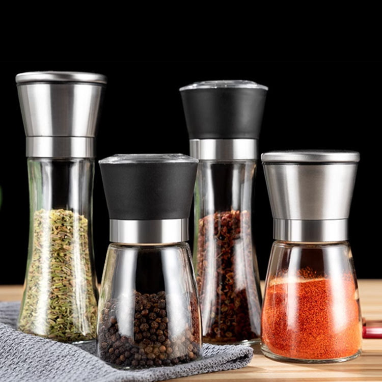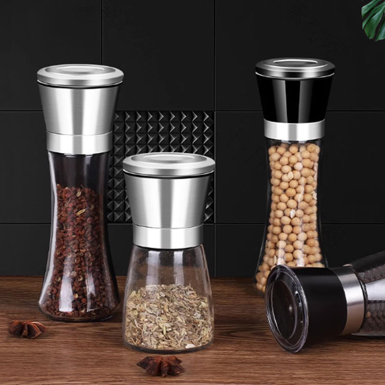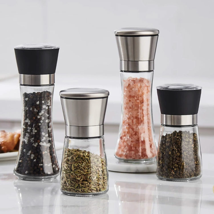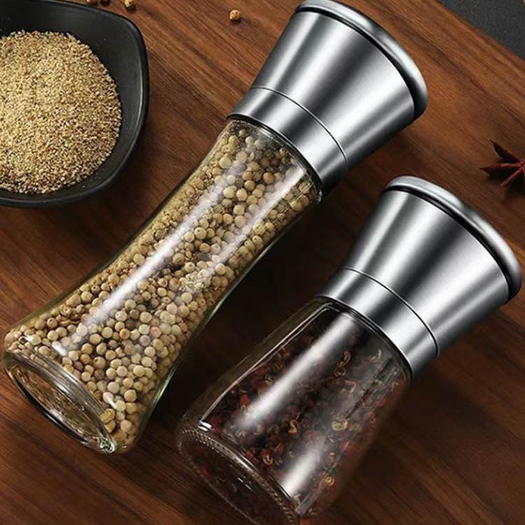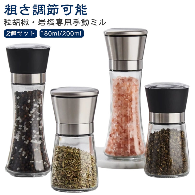 ペッパーミル ソルトミル 2個セット 手動式 粗さ調節可能 ガラス瓶 ステンレス製 食洗機対応 洗える スパイスミル 岩塩 黒胡椒用 スリム キッチン用品 調理道具 省スペース