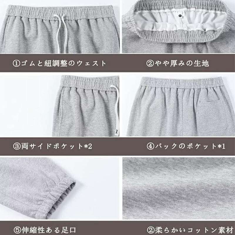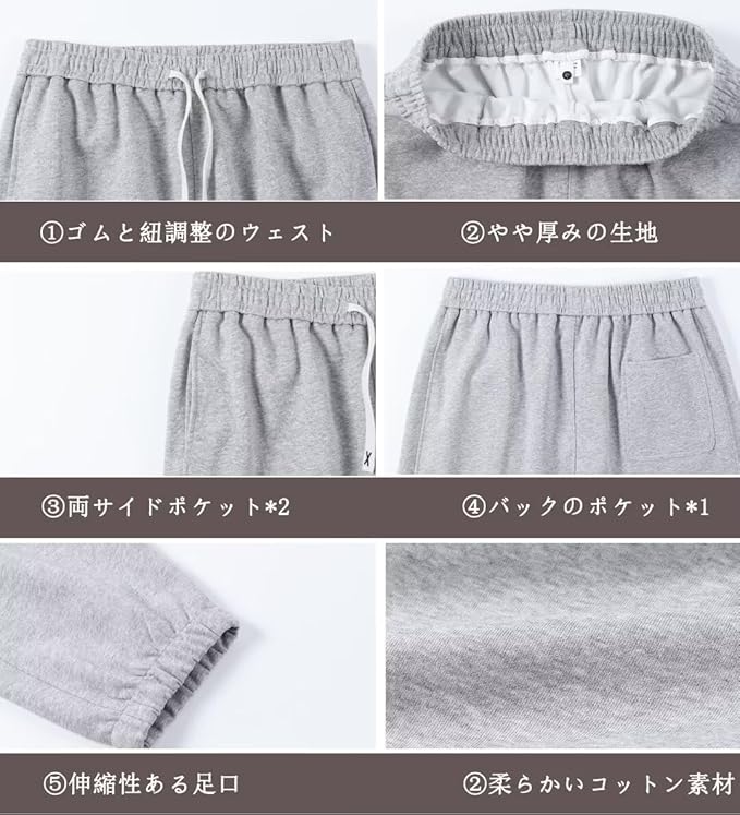 【通気性が良い】コットン素材で、通気性が良くてスポーツパンツとして快適であらゆる運動に適しています、生地は柔らかく、動きやすくて、ジョギングやランニングやフィットネスにも最適です。ヒップ周りもゆったり作られているので普段着や部屋着としても履けるスウェットパンツです。ポケットが3つあり、小物収納や買い物でも困りません。