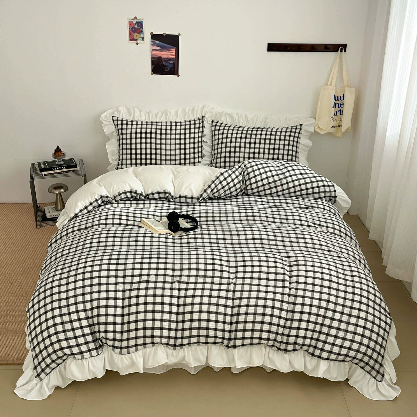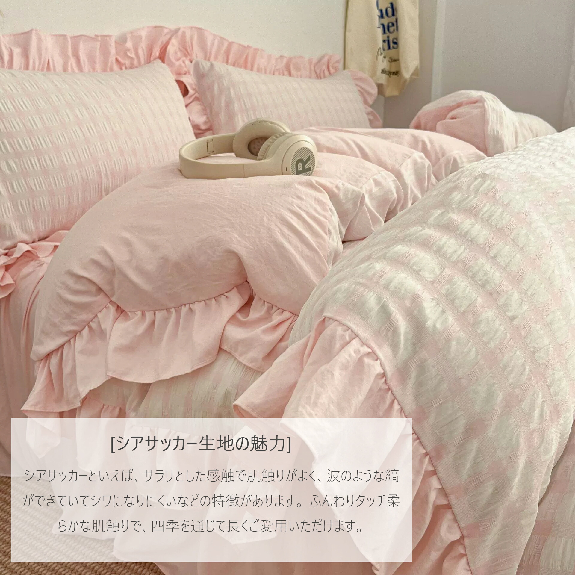 布団カバー シングル 3点セット シアサッカー生地 チェック柄 掛け布団カバーフリル付き 掛けカバー 掛けふとんカバー 布団セット かわいい セミダブル ベッドカバー 敷布団カバー 寝具カバーセット