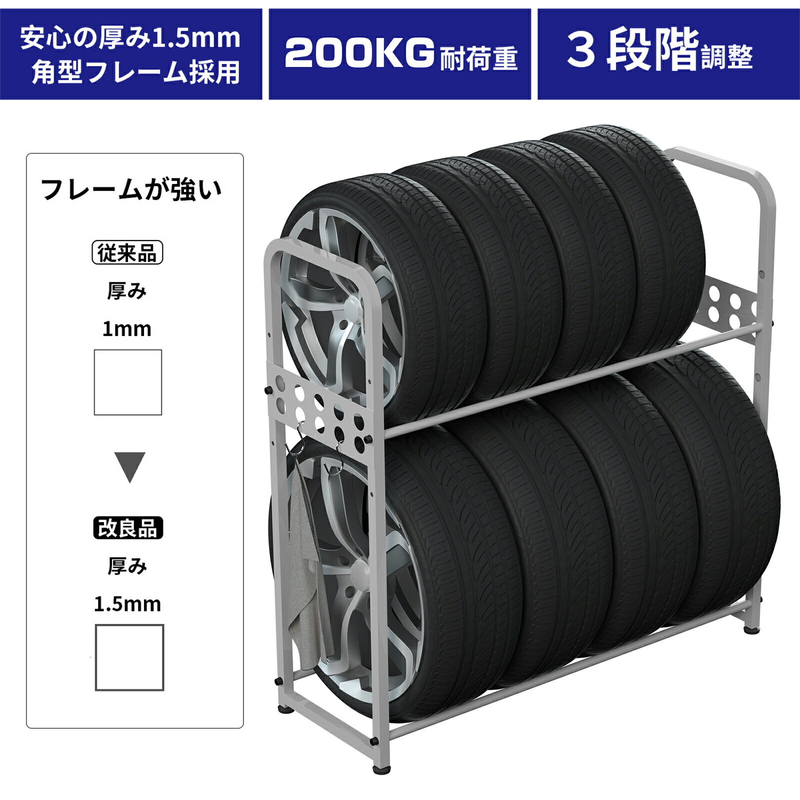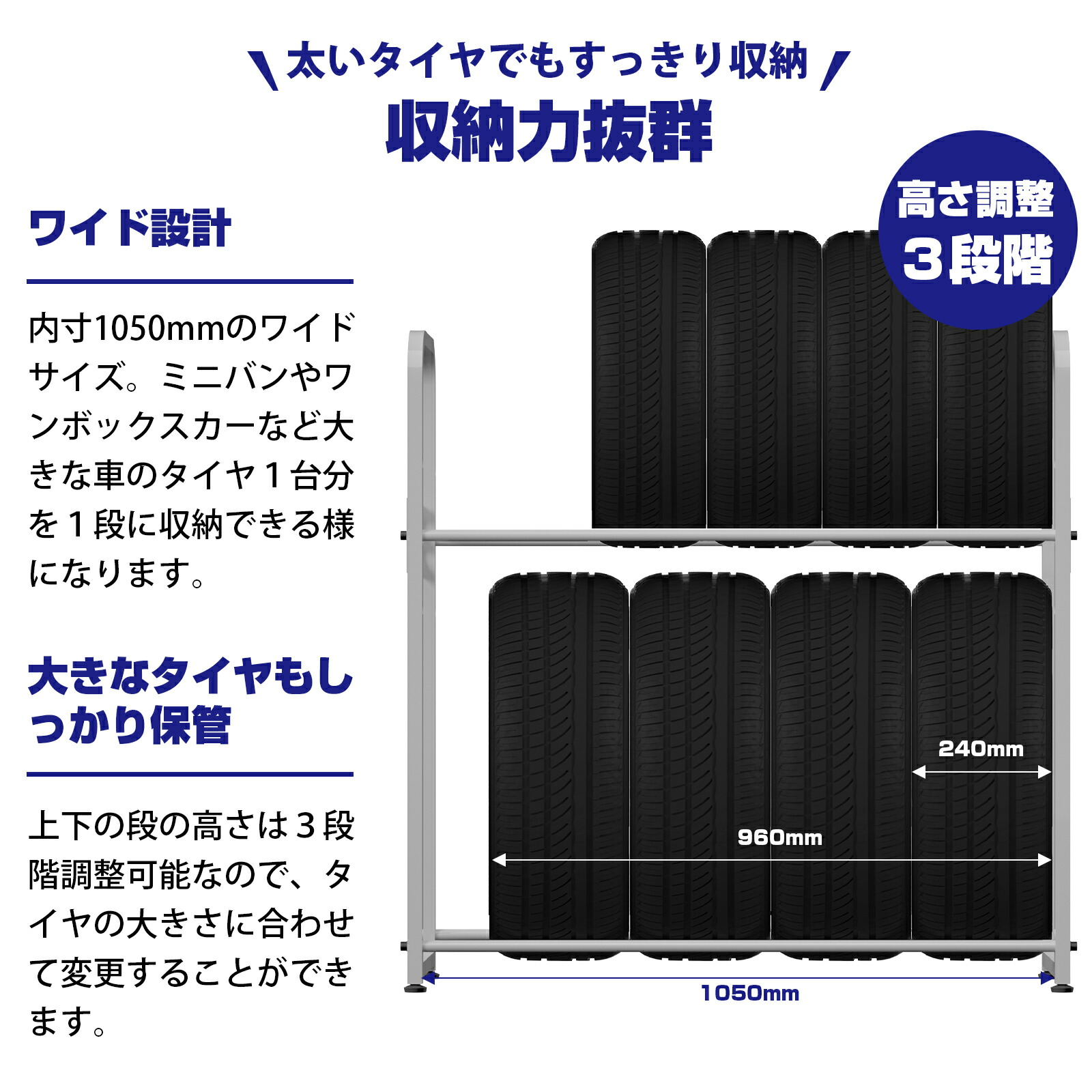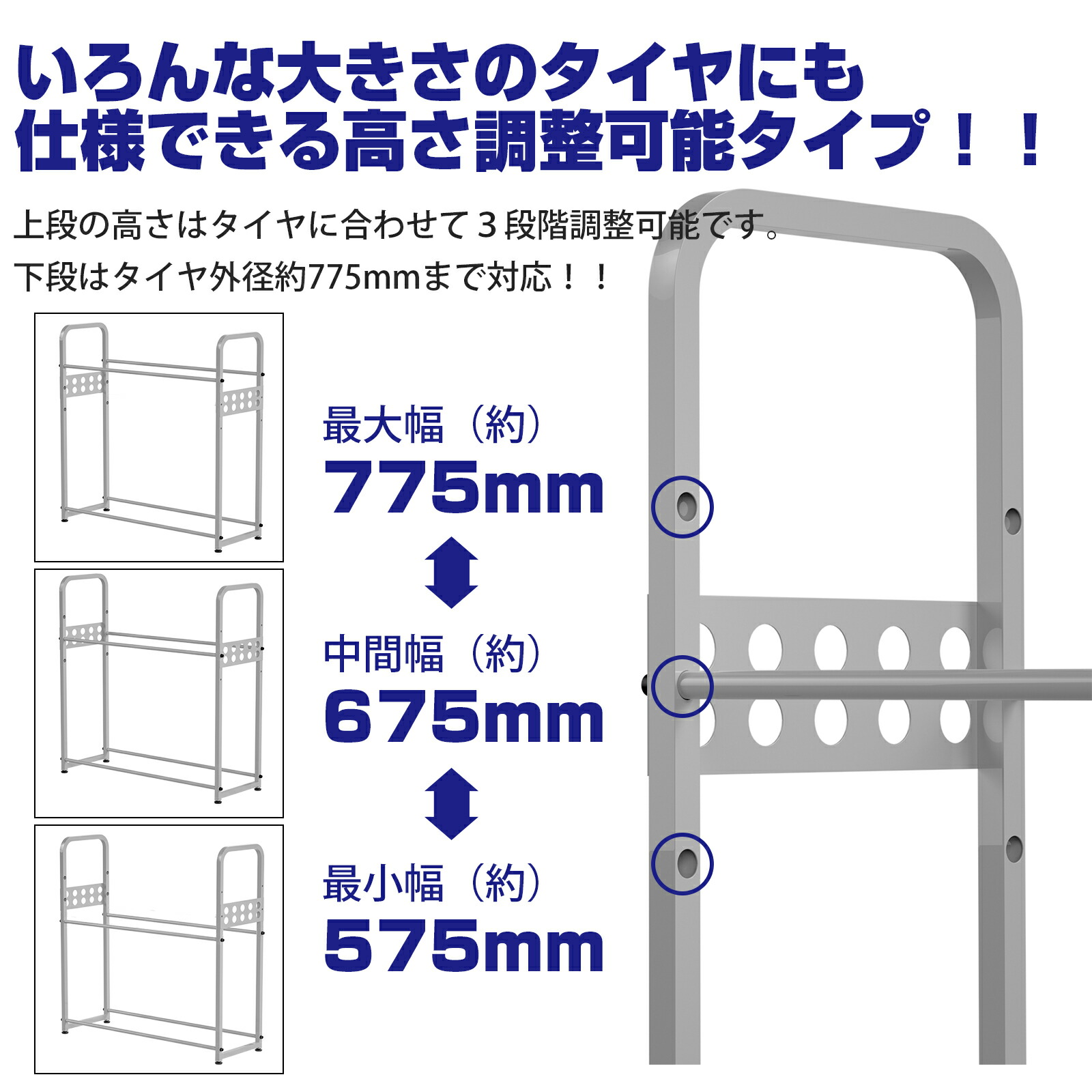 上段の高さはタイヤに合わせて3段階調節が可能です。一般家庭の乗用車・RV車・ワゴン車のタイヤに対応!