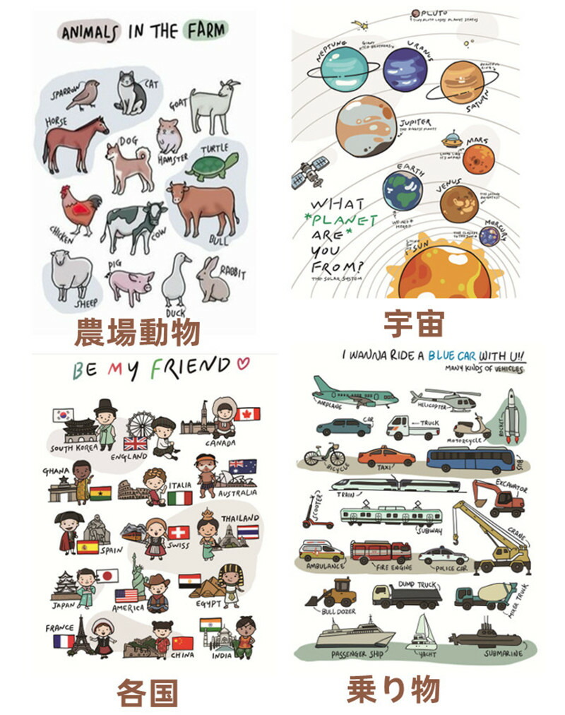 ポスター 知育 シール 幼児 知育ポス 野菜 数字 果物 日常用品 形状 ABC 海洋動物 野生動物 農場動物 宇宙 国 乗り物