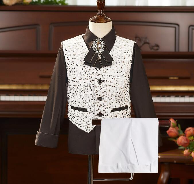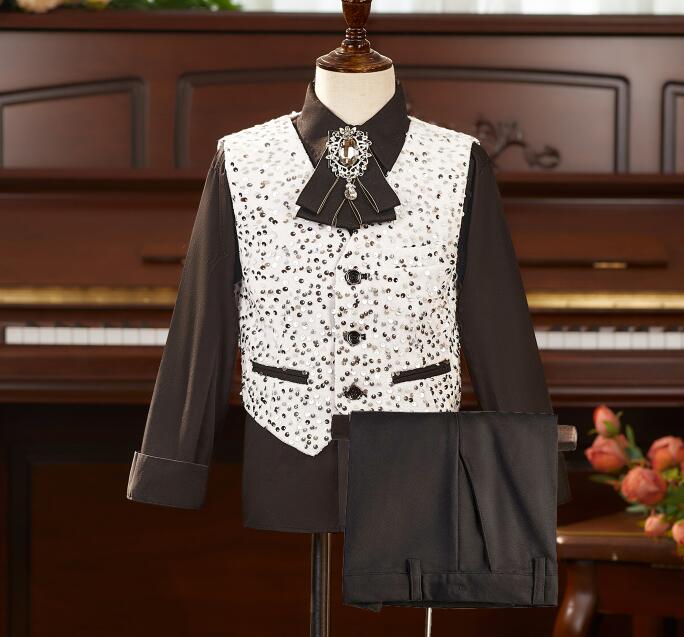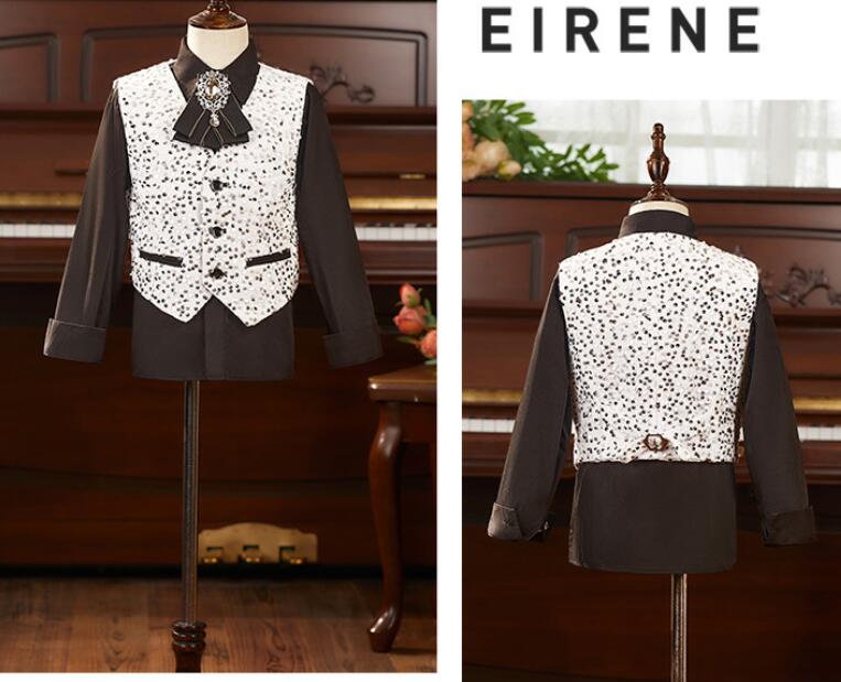 男の子 スーツセット 子供 スパンコールベスト ワイシャツ パンツ追加可能 キッズベスト 豪華なキッズ 舞台演出服 銀色スパンコール ピアノ演出服 結婚式 モ キラキラ
