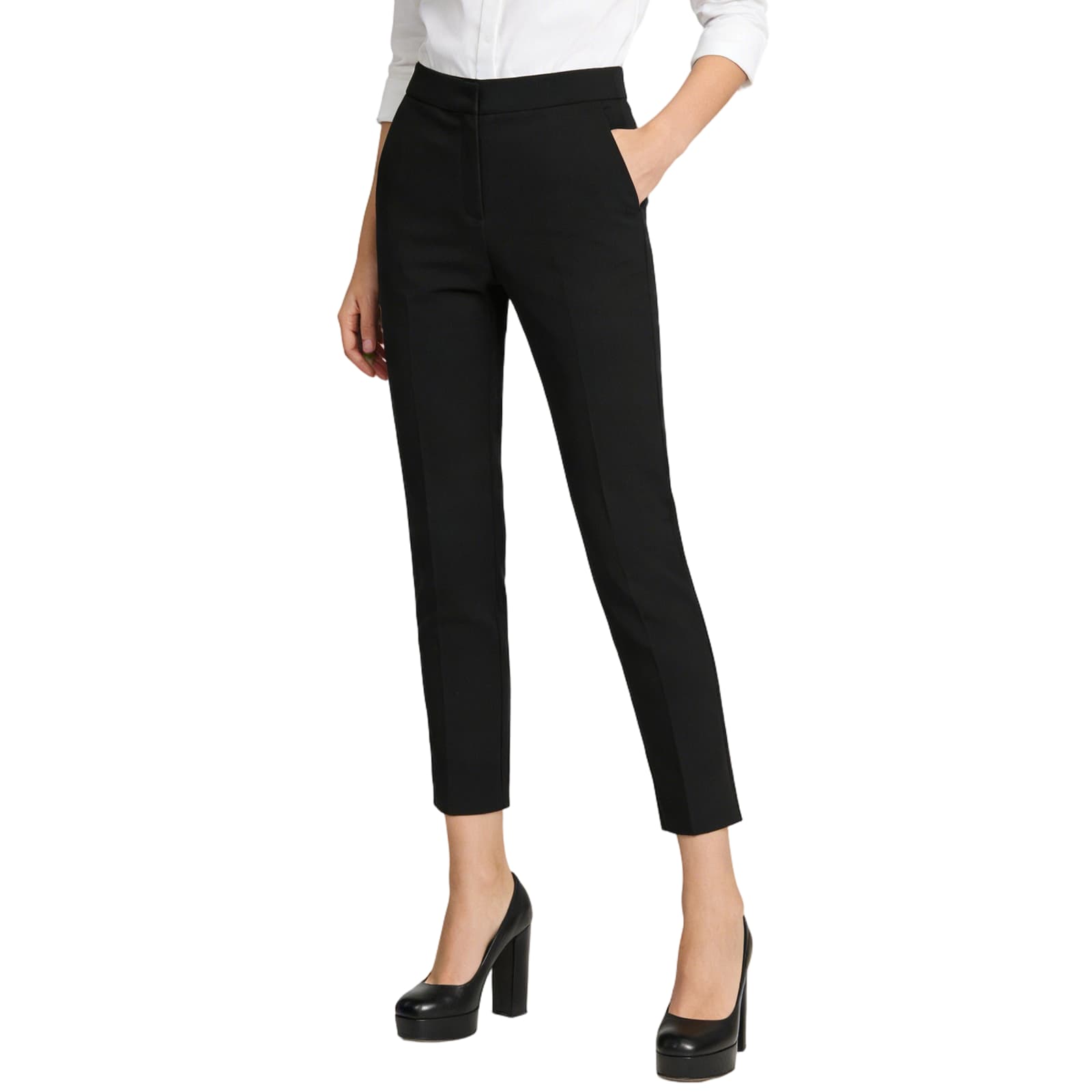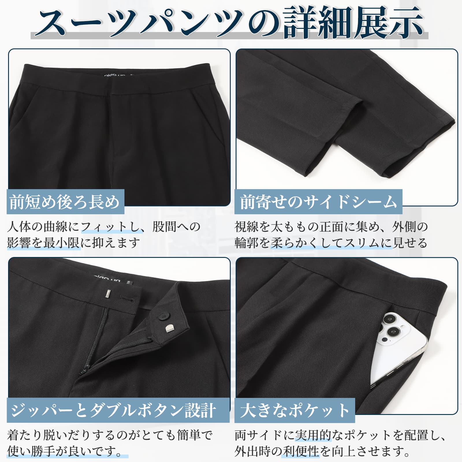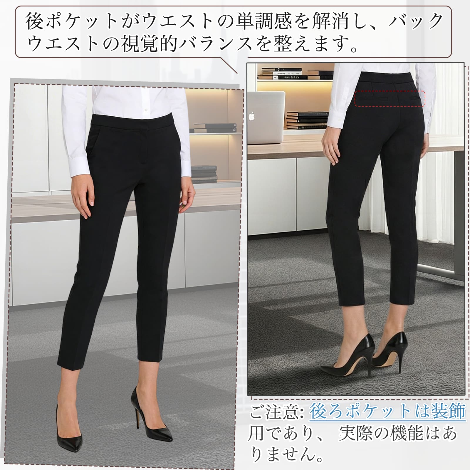 ジッパーとダブルボタンによる確実な閉じ具合が特長のカプリパンツです。両サイドには実用的なポケット付き、小物の収納に便利です。また後腰におしゃれなフェイクポケットを配し、ウエストの単調さをなくし視覚バランスを高めます。このスラックスは、フォーマル・カジュアル問わずあらゆるシーンで違和感なく使える実用的な黒ズボンです。