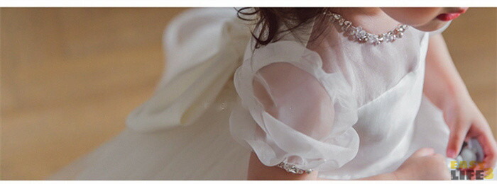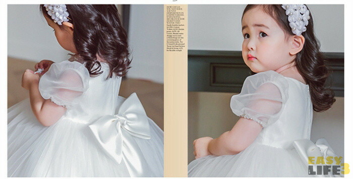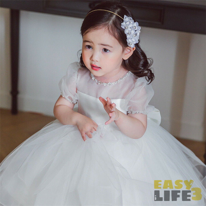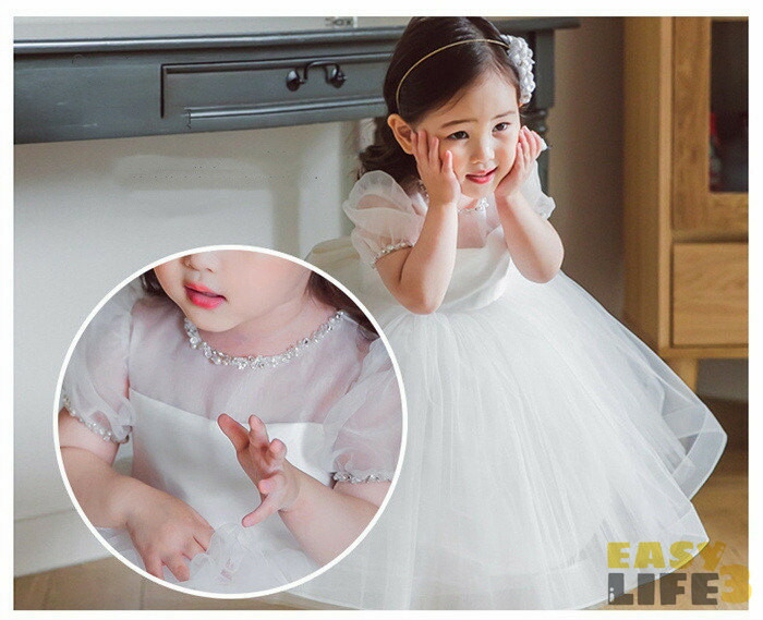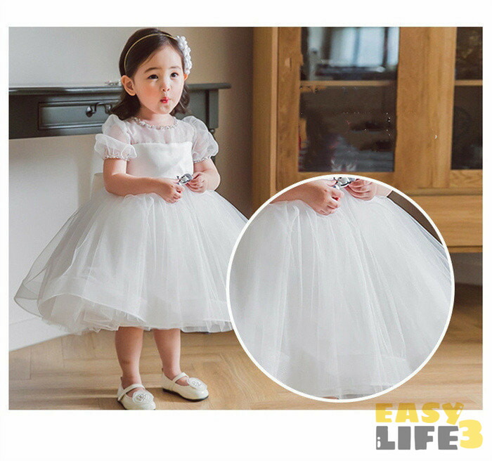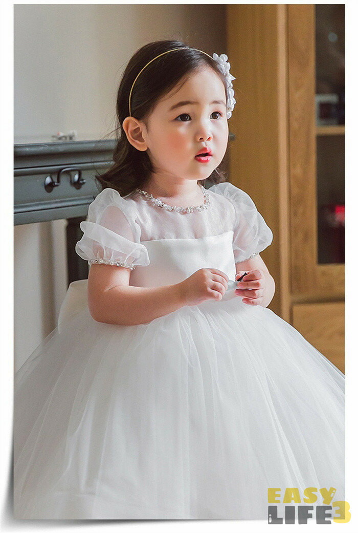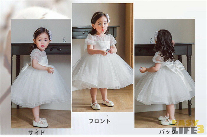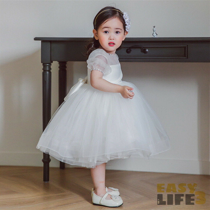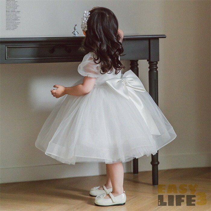子供ドレス 女の子 ドレス ワンピース チュール 蝶結び 春夏 リボン バブルスリーブ ベビードレス ベビーワンピース 可愛い キレイめ セレモニードレス 結婚式 プリンセス フォーマル 子供服 白