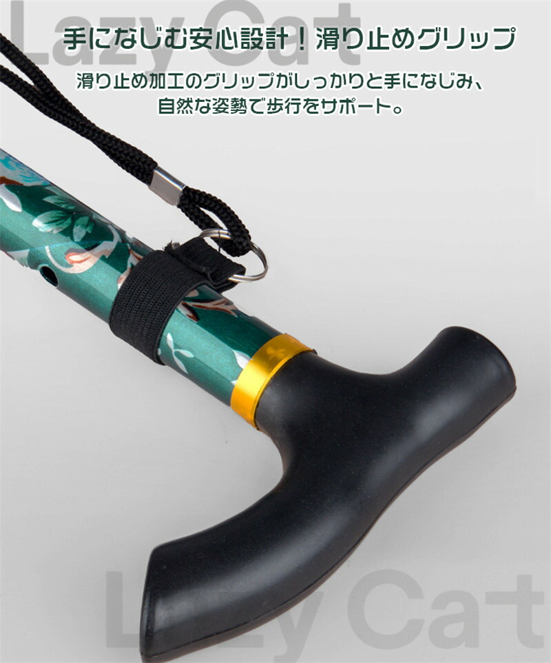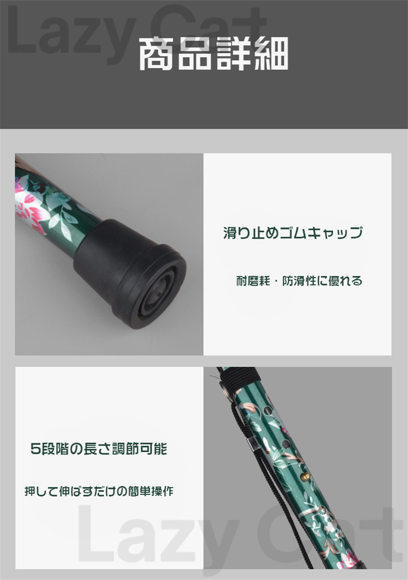 【商品材質】:支柱:アルミ、握り部:プラスチック、杖先ゴム:合成ゴム、ストラップ:ナイロン