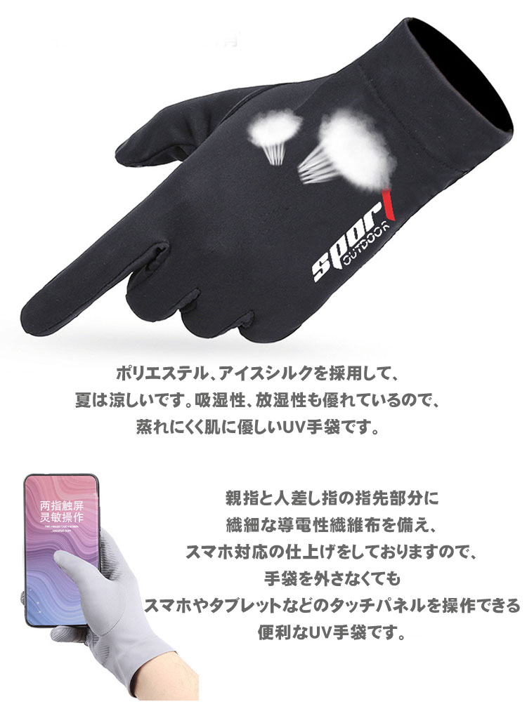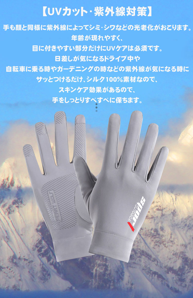【素材】ポリエステル、アイスシルクを採用して、夏は涼しい、吸湿性、放湿性に優れているので、蒸れにくく肌に優しい手袋です。