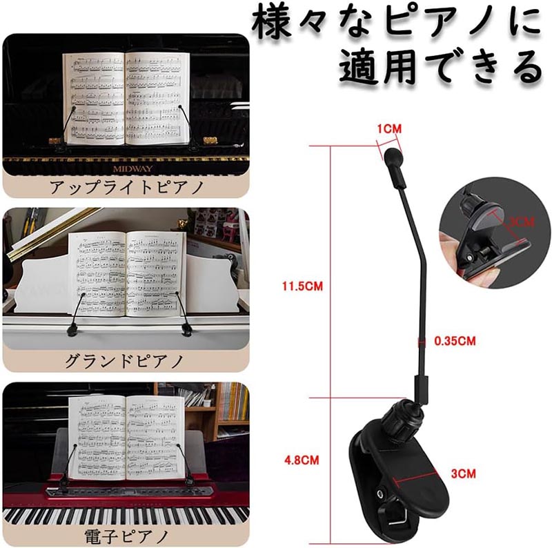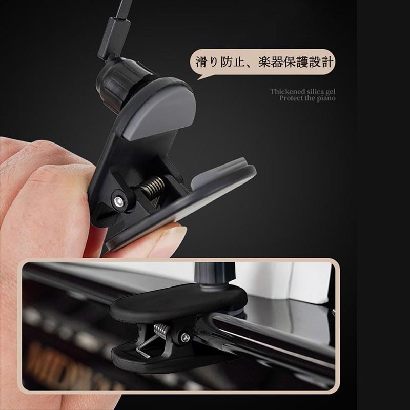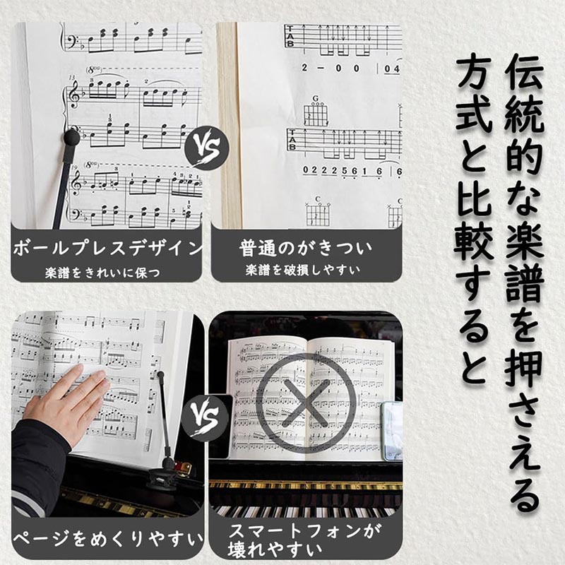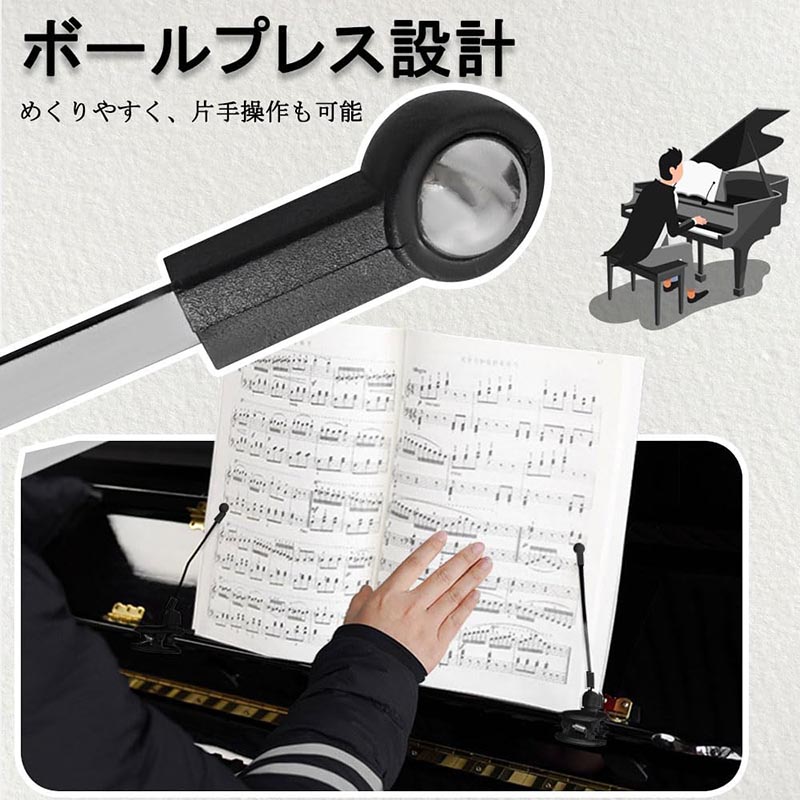 【楽譜やピアノを傷つけない】ボール転がし式のデザインで、楽譜に接触する際、楽譜が傷つくのを効果的に防ぎます。クリップにはシリコーンゴム製圧条が付いており、ピアノにダメージを与えるのを防ぐことができます。