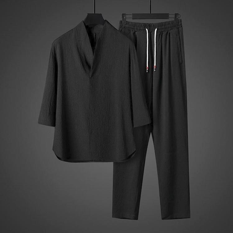 襟付きVネックトップスと調節可能な紐付きパンツの上下セット、シンプルでスタイリッシュなカジュアルウェア。