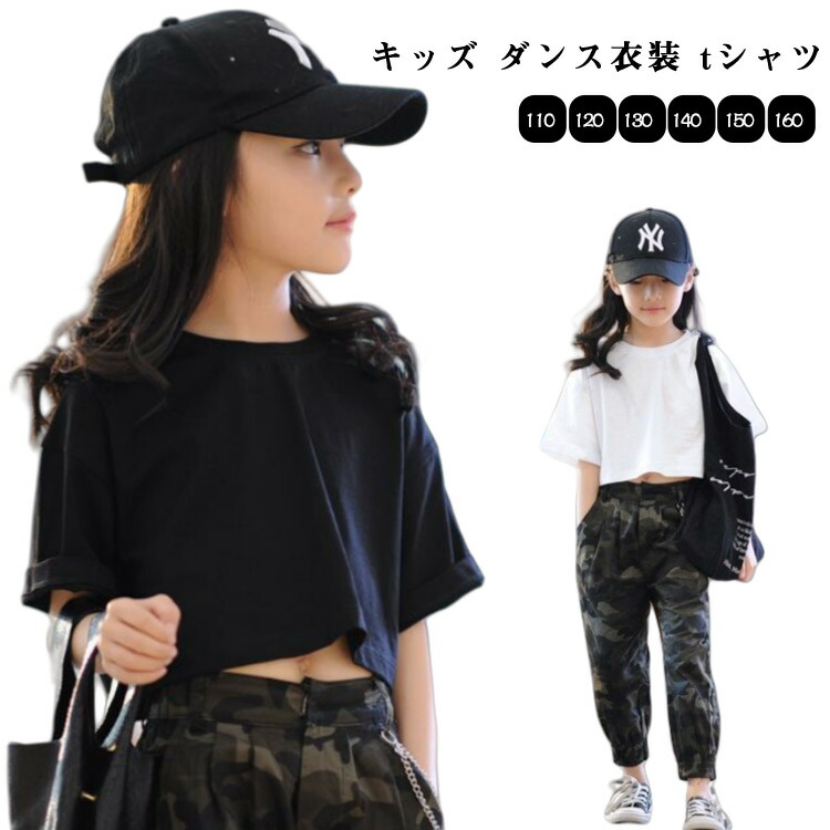 ダンス衣装 キッズ tシャツ トップス へそ出し ショート丈 女の子 ヒップホップ 短め 黒 白 セクシー 半袖 レディース ガールズ ジュニア ジャズ k-pop 韓国 発表会 無地