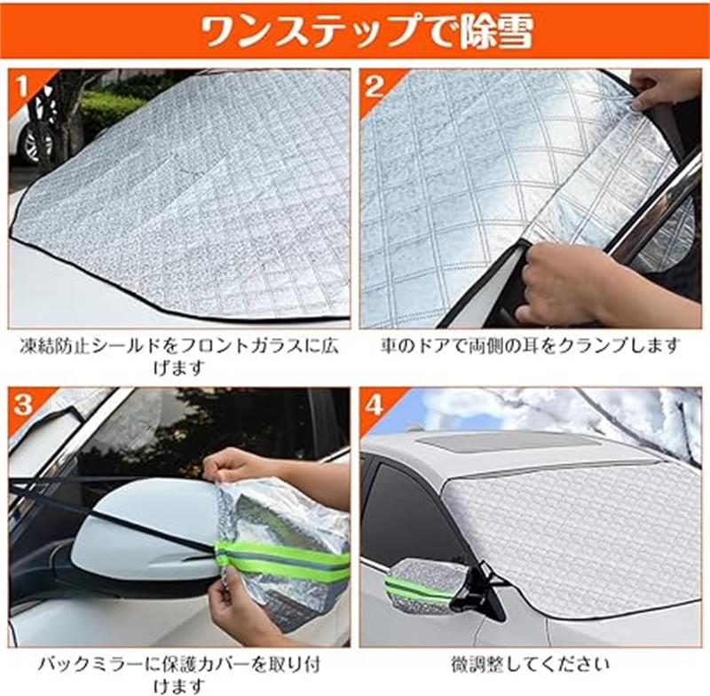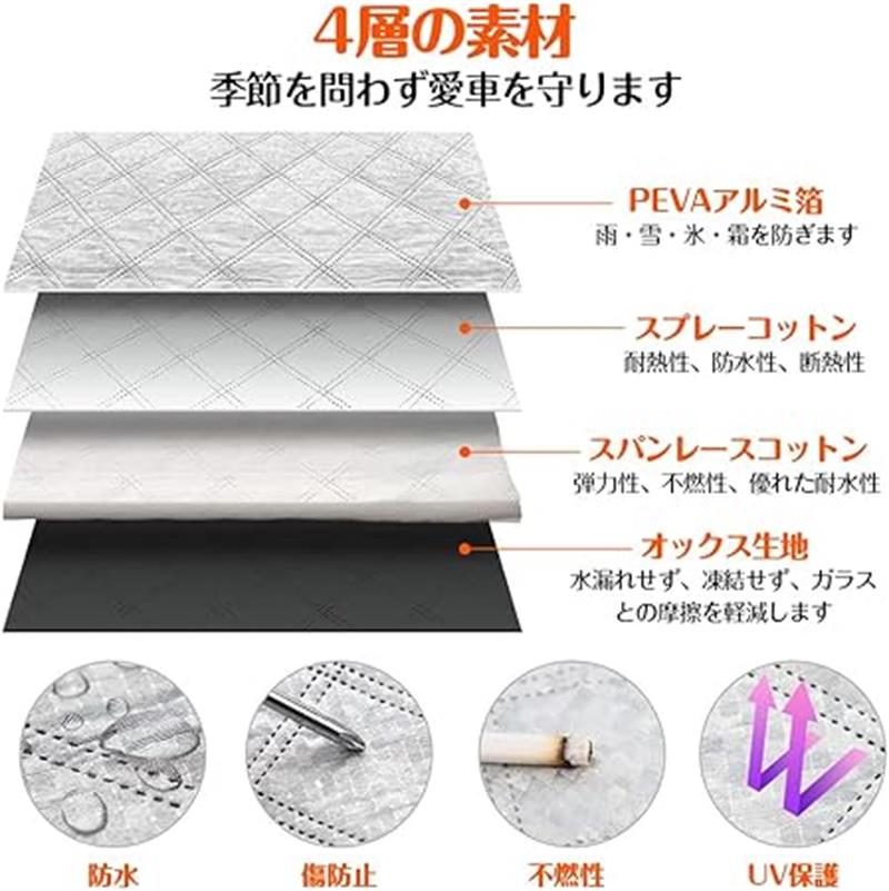【四層構造】 表面素材はPEVAアルミ箔で、傷がつきにくく耐久性に優れています。 防水性もあり、車のフロントガラスを雪、雨、霧、氷から守ります。裏面は不織布で、車を傷つけません。紫外線を遮断し、ワイパーやフロントガラスの寿命を効果的に延ばし、夜間の霜の発生を効果的に防ぎます。