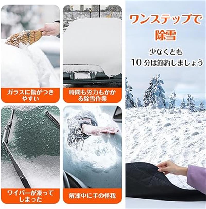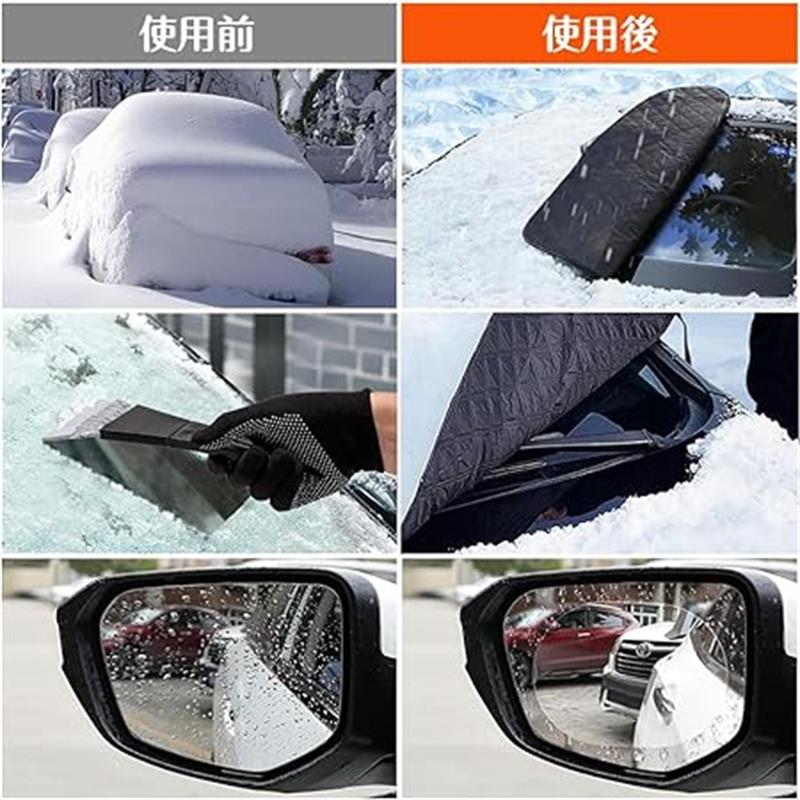 【氷・雪の堆積を防ぐ】 凍結防止カバーを外すだけで簡単に除雪できます。朝の出発が楽になり、通勤時間も短くなります。フロントカバーは非常に厚く、大きく、ワイパーやフロントガラスだけでなく、両側のガラスの一部も覆っています。