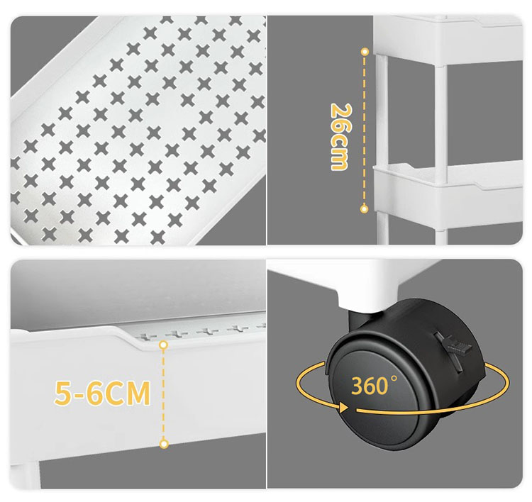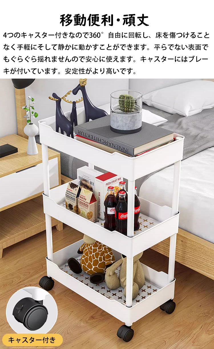 ※移動便利・頑丈:4つのキャスター付きなので360°自由に回転し、床を傷つけることなく手軽にそして静かに動かすことができます。平らでない表面でもぐらぐら揺れませんので安心に使えます。キャスターにはブレーキが付いています。軽くて移動しやすいのがメリットですが、安定性に欠けるのがデメリットなので、安定性を高めるために洗濯洗剤などの重いものを下の層に置くことをおすすめします。