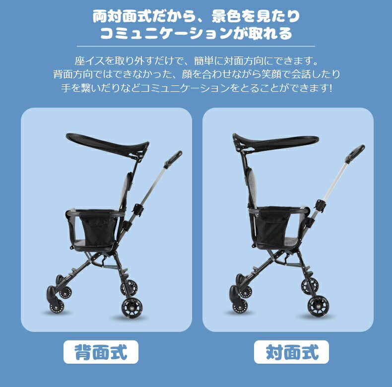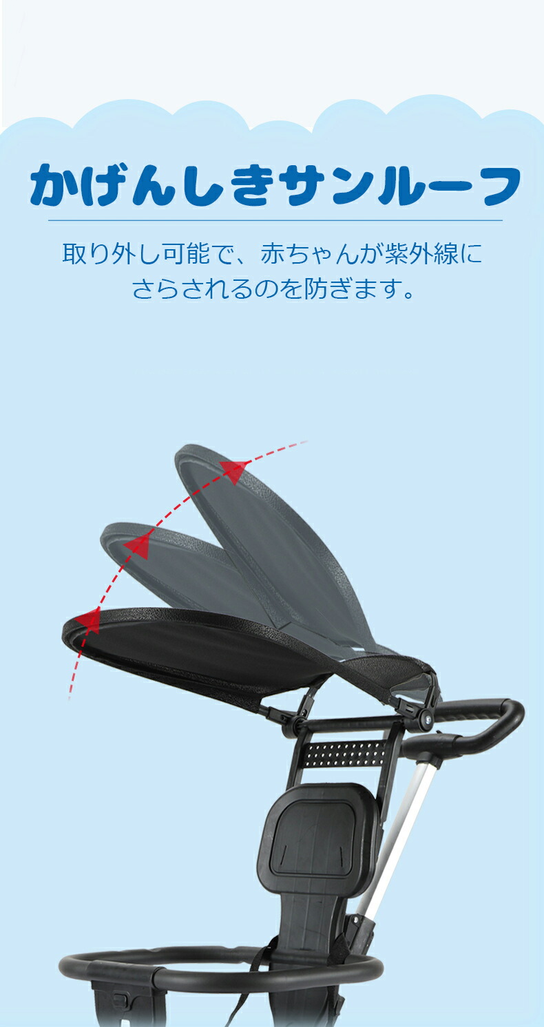 その他、赤ちゃんを前向き、後ろ向きに変更できる機能や、夏の暑い陽射しから守るサンルーフやクッション付き。