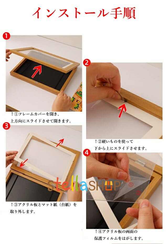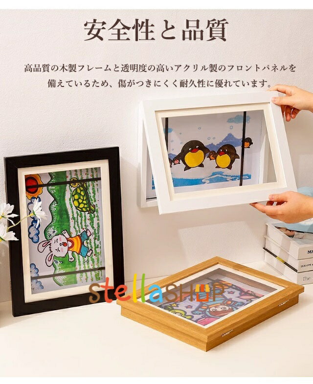 【品質向上、子供にもっと適しています】フレーム素材:高品質の木材、フロントパネルは高透明アクリル板で、傷に強く耐久性に優れています。(ご購入時には保護フィルムが貼られていますので、ご使用前に剥がしてください。)背面の留め具は回転爪式で簡単に交換できます。滑らかなデザインで手を傷つけず、お子様やご年配の方にも適しています。