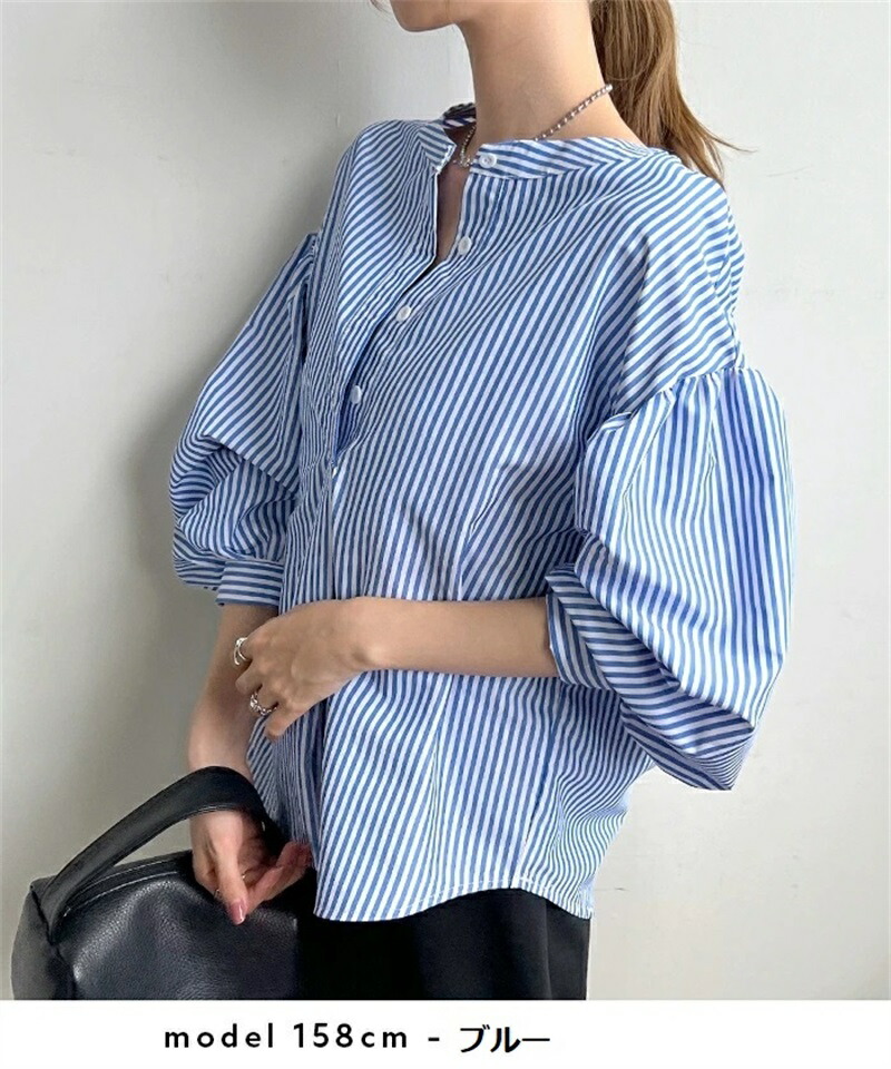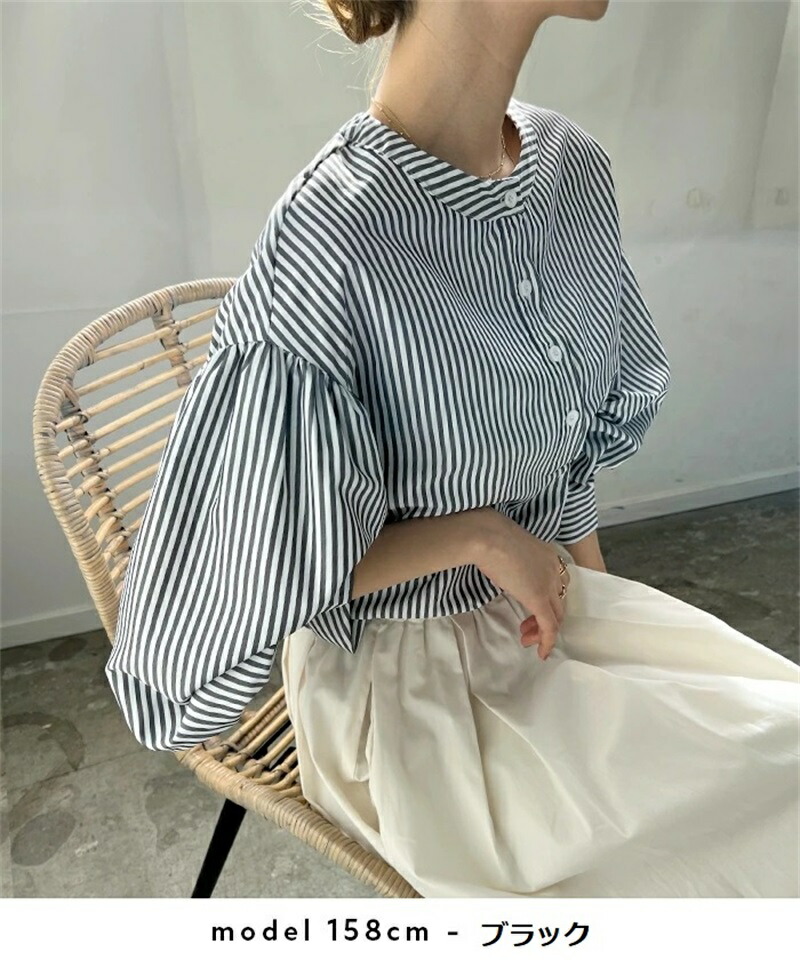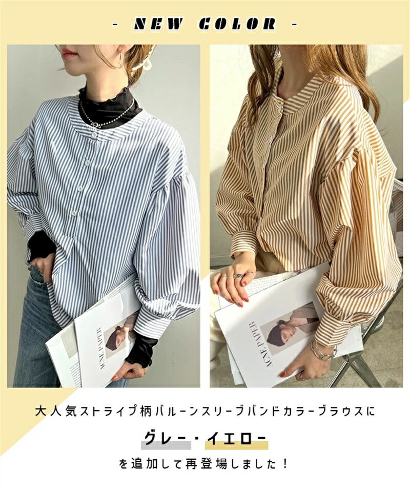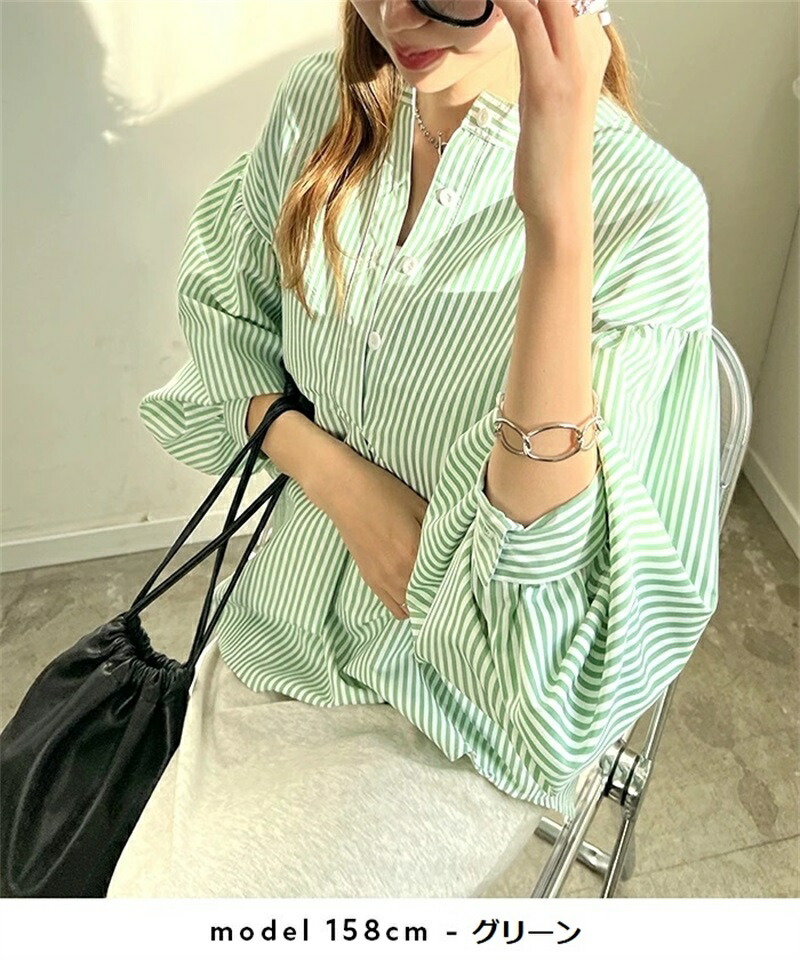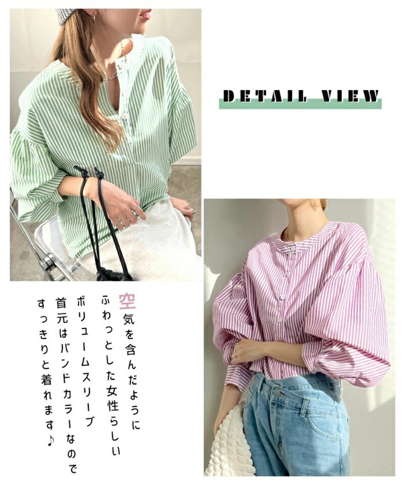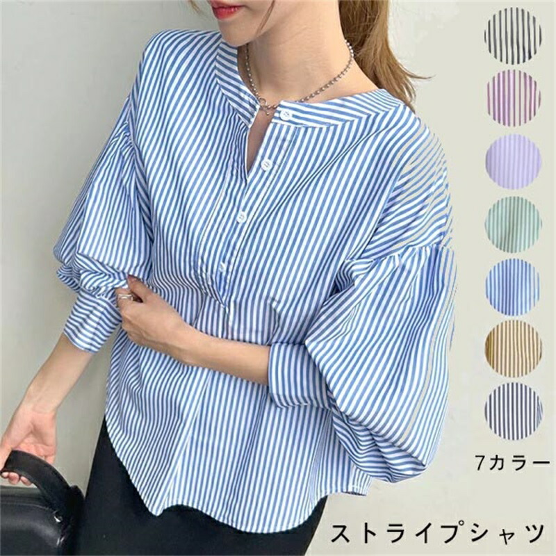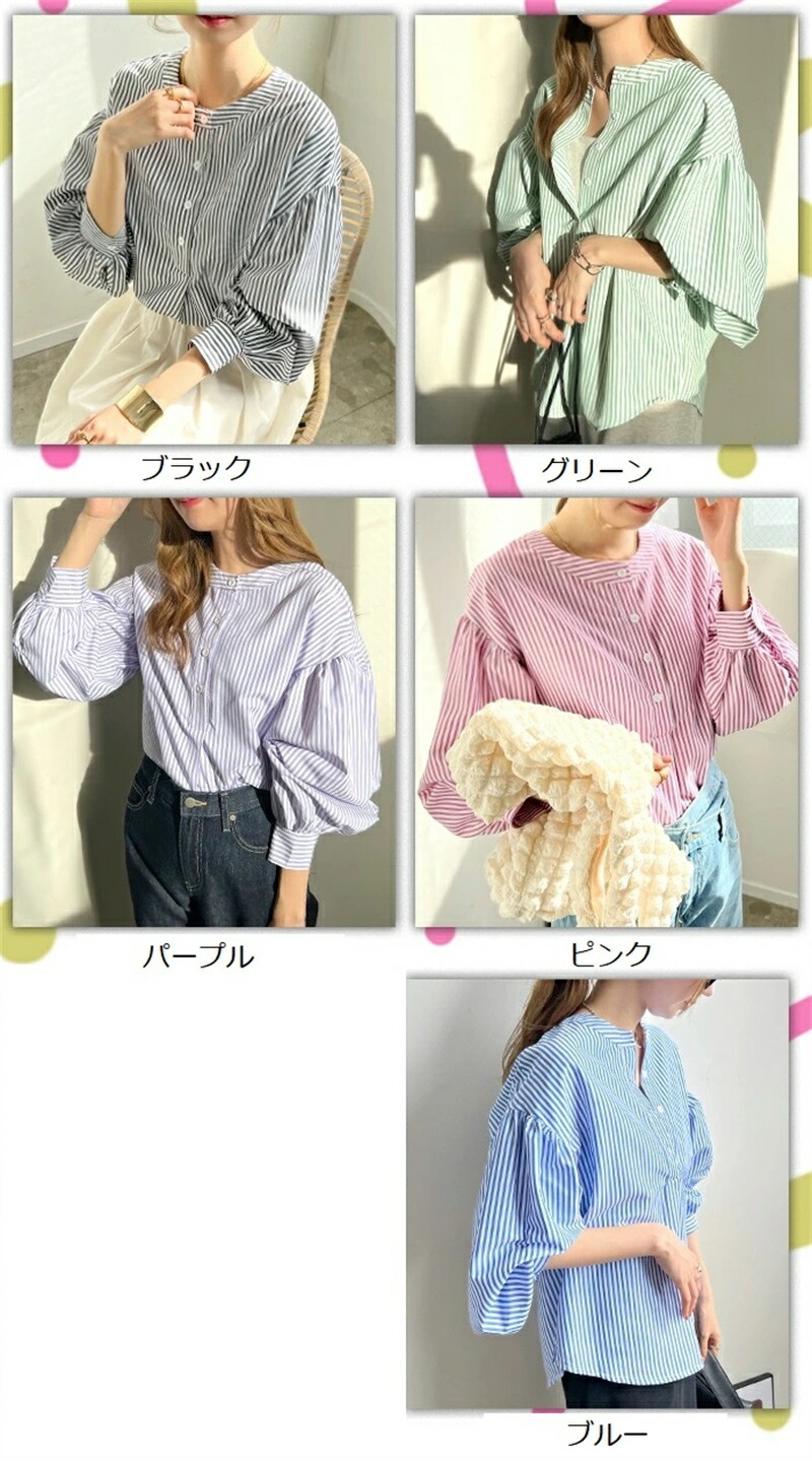 新着 春夏 バブル袖 ストライプシャツ レディースファッション 超目玉商品 ブラック グリーン パープル ピンク ブルー グレー イエロー