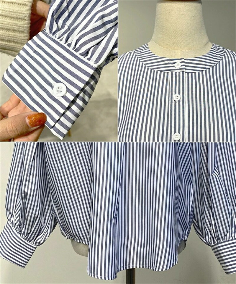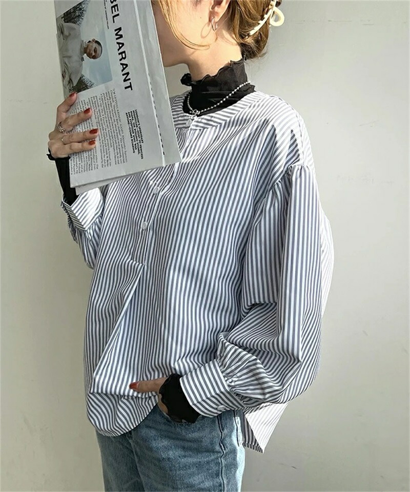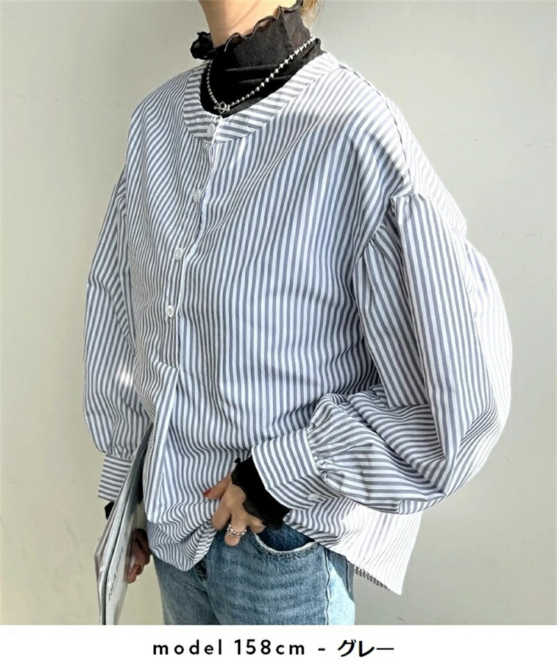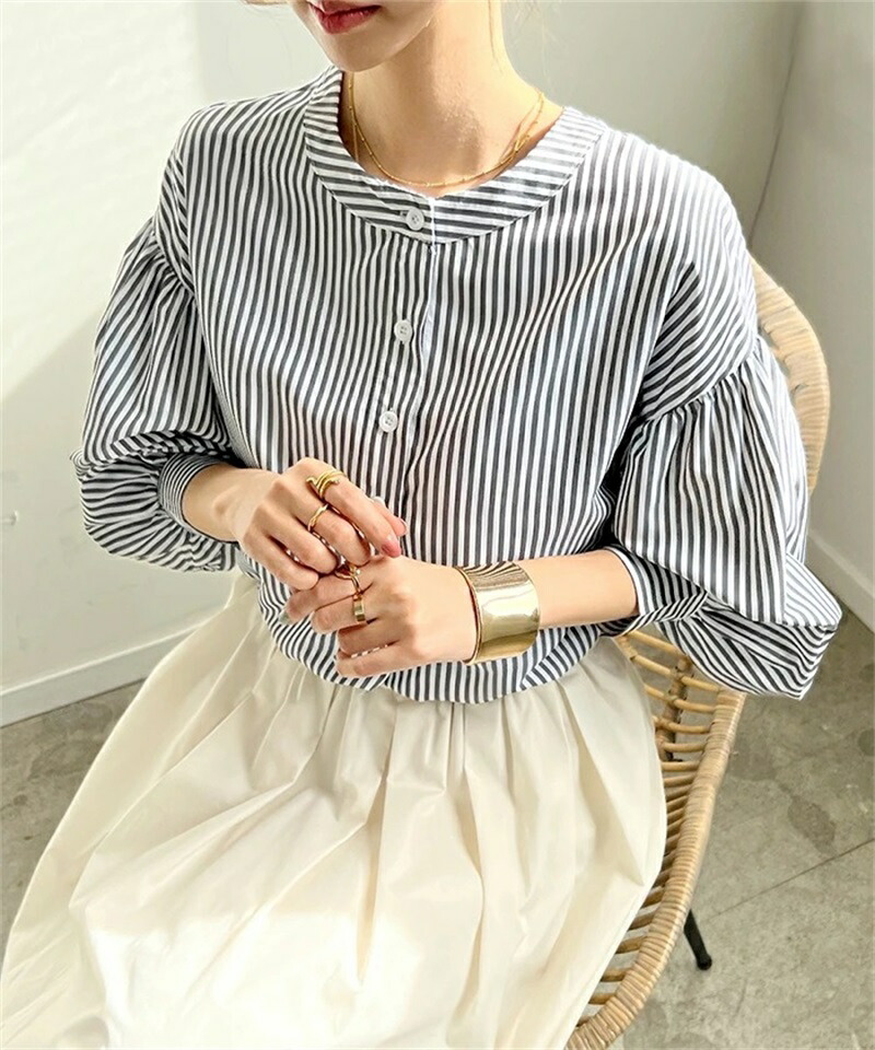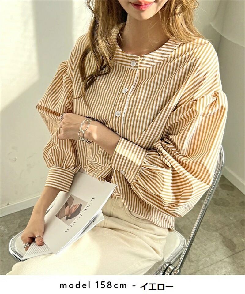 新着 春夏 バブル袖 ストライプシャツ レディース マルチコーディネートトップスシャツ ブラウス シンプル