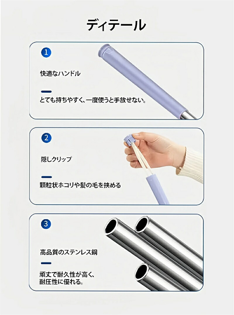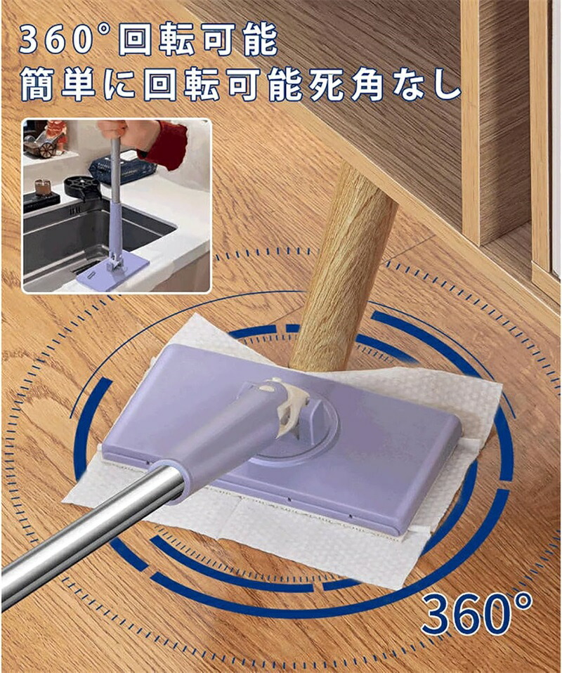 自動で雑巾を挟むモップ、クレンジングタオルが一瞬でモップに変身、手洗い不要/自動でシートを挟む/360°回転可能。ハンドルで軽く押す、1秒だけでクロスを挟める、従来の掃除方法を変える手を汚さず/接触しない/高所に使える、軽く回転させて、隅々まで清潔に。