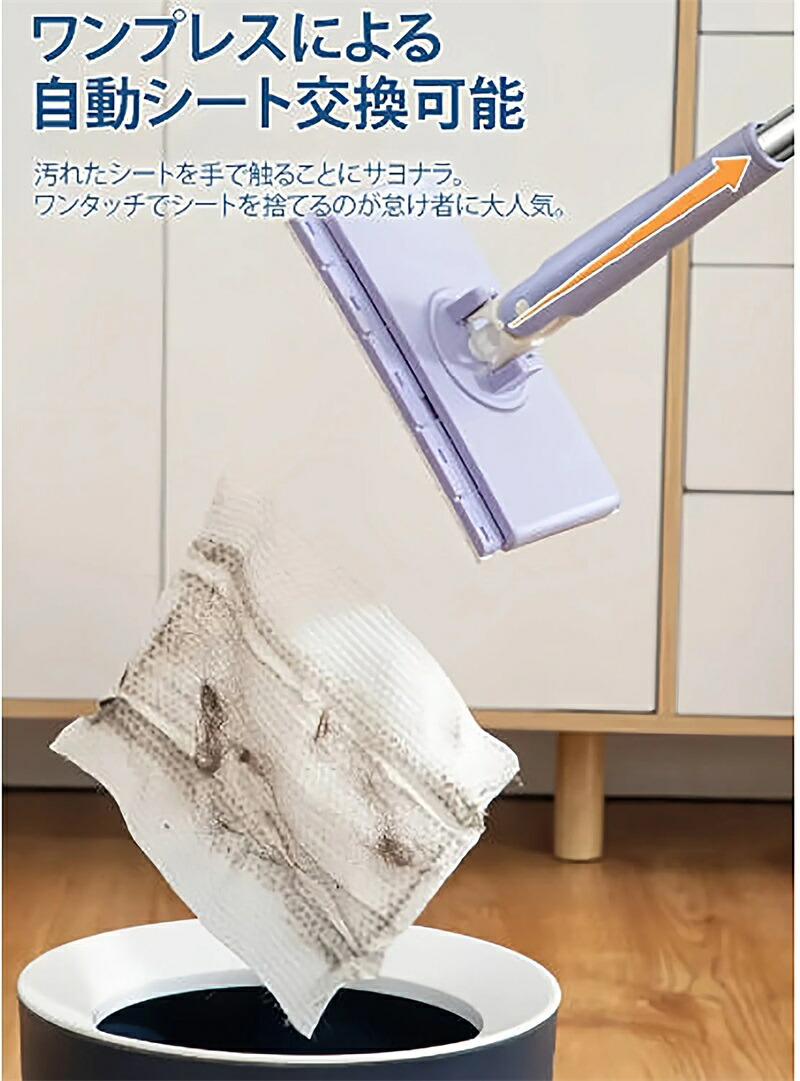 ワンプレスによる、自動シート交換可能、汚れたシートを手で触ることにサヨナラ。ワンタッチでシートを捨てるのが怠け者に大人気。腰を曲げたりしゃがんだりせずに、狭い隙間も楽に掃除できる。家中のあらゆる隅々までの汚れをこれで一発に解決!