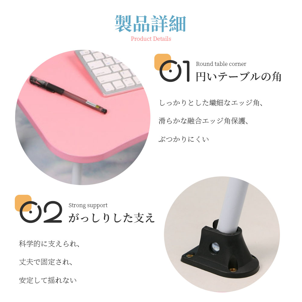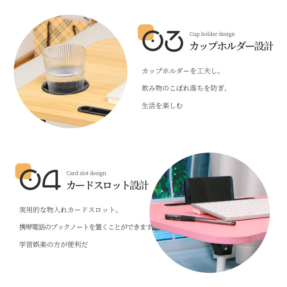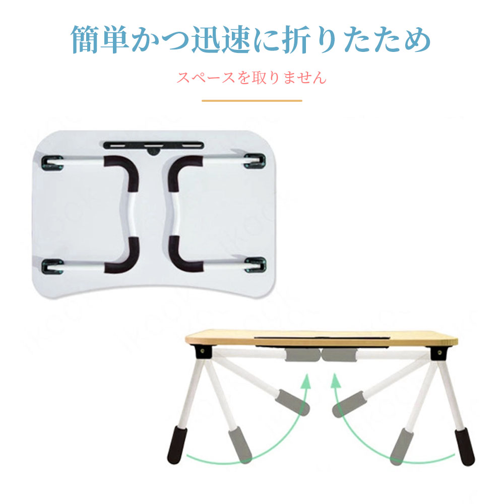 設置、使用、収納が快適 テーブルの足は開くだけで組み立て不要です。引き出しも引っ張るだけの出し入れ可能な設計となっています。ブックスタンドはテーブル裏に設置されており、テーブル溝に合わせて差し込むだけの簡単デザインです。脚を折りたたんでベッドの下やソファーの下、狭い隙間にも収納が可能です。