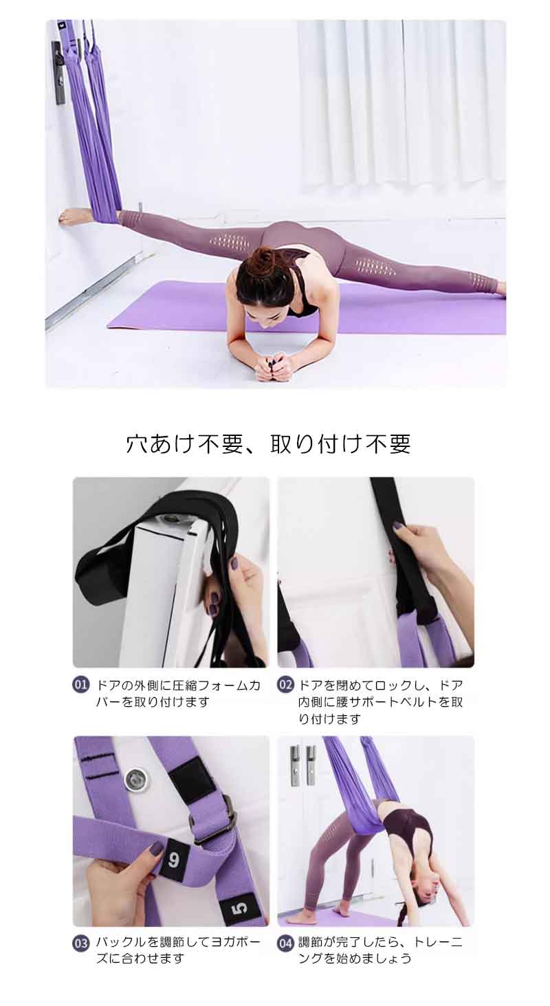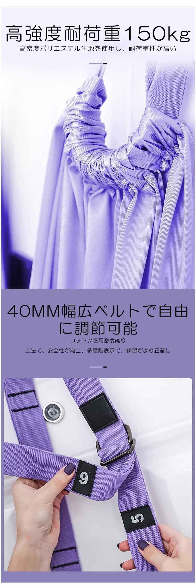 エアリアルヨガ ヨガベルト ヨガハンモック 空中ヨガ ヨガバンド エクササイズ ヨガストラップ ドアに固定 ピラティス 筋トレ 扉に固定 自宅用 長さ調節可 取り付け簡単 逆立ち補助 筋肉ストレッチ スポーツ 運動器具 伸縮性 多用途 シンプル ピンク / パープル / グリーン