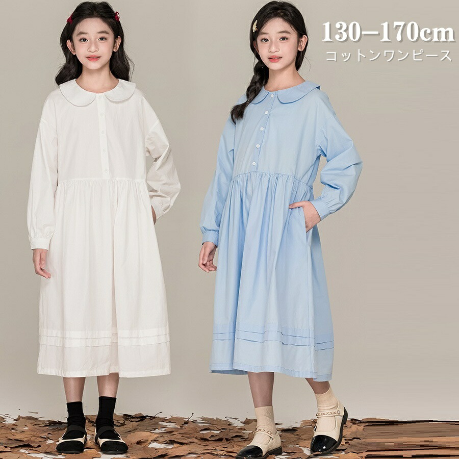 女の子 ワンピース 長袖 160 綿 キッズ ワンピース 豊富 白 水色 130cm 140cm 150cm 160cm 170cm