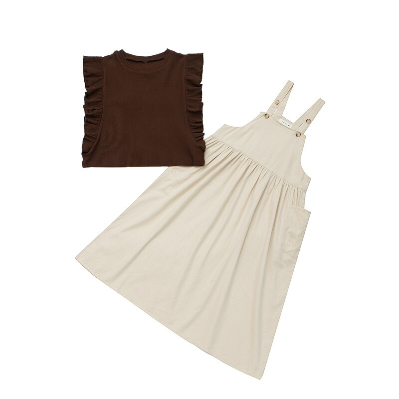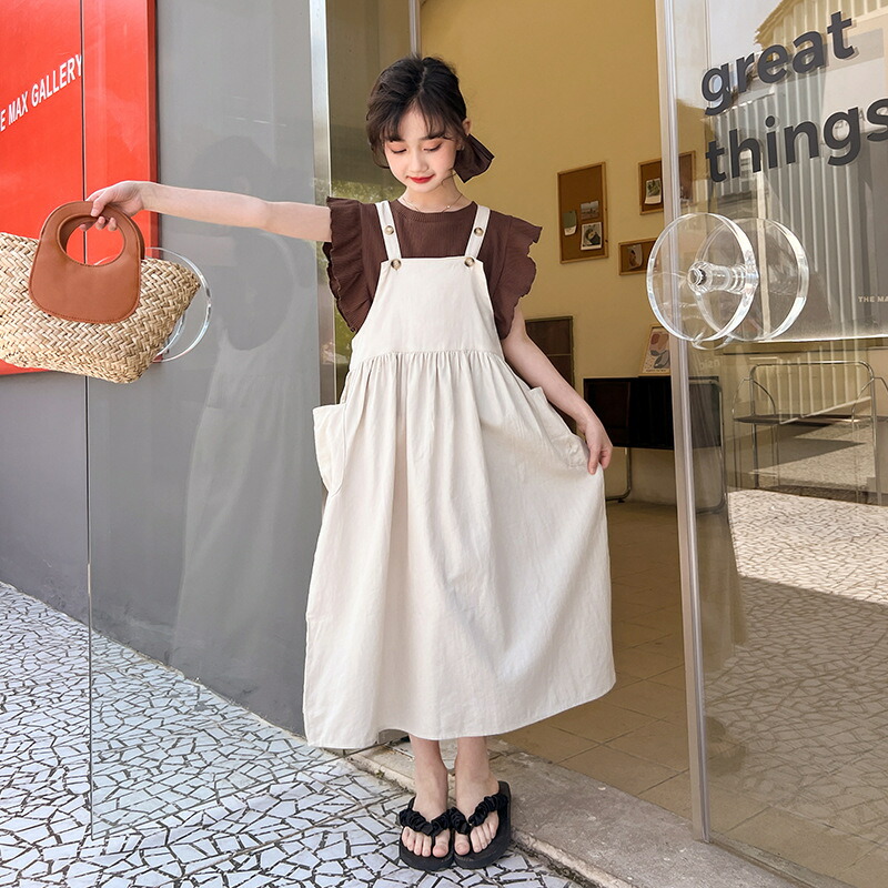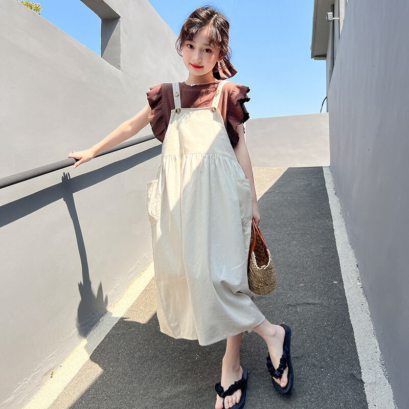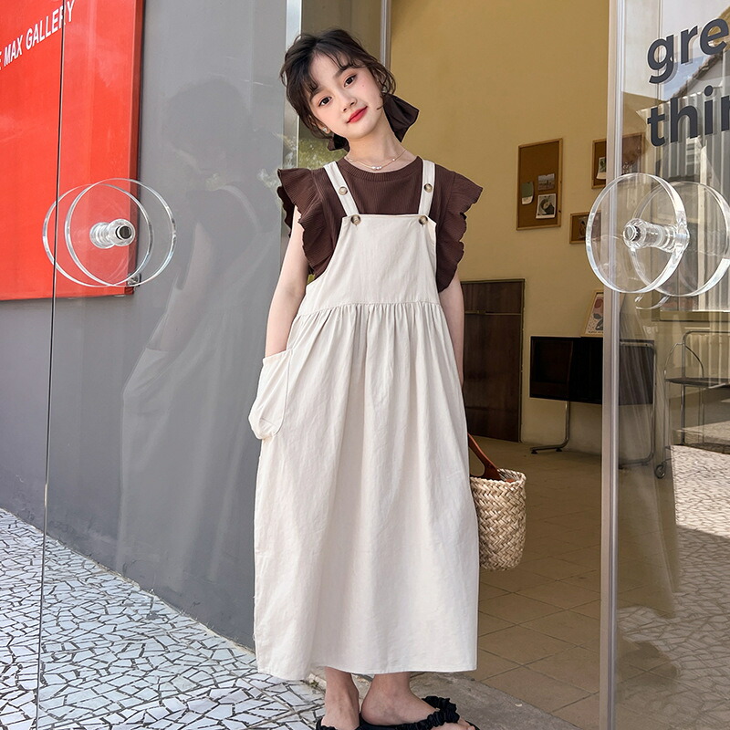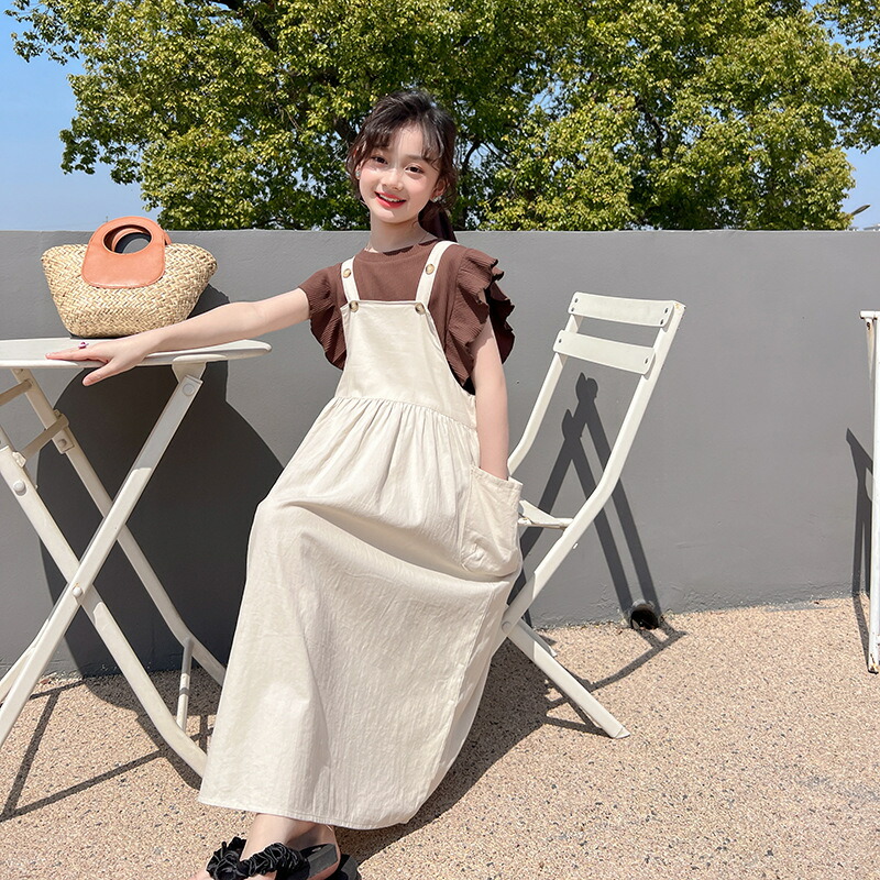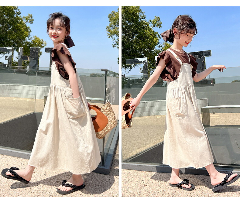 子供服 サロペット 2点セット ジャンスカ トップス ブラウス ロングワンピース サスペンダースカート フレアワンピース 女の子 キッズ 体型カバー オーバーオール 調節可能 秋 春 ジュニア 可 夏