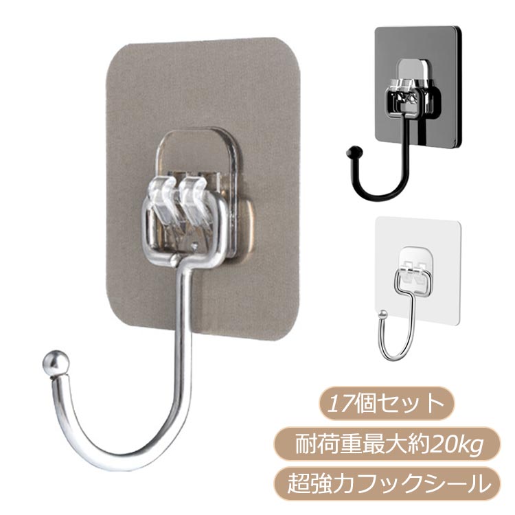 はがせる 防水 粘着 フック 壁掛けフック 17個セット 超強力 粘着フック 賃貸 透明 シール グレー 耐荷重20kg 穴開けない フックシール キッチン お風呂 バ 繰り返し使える