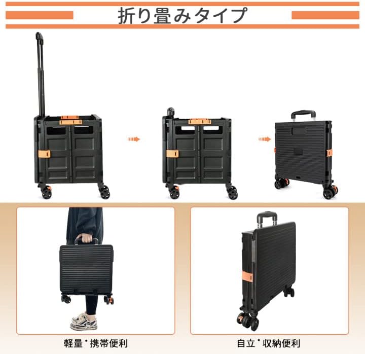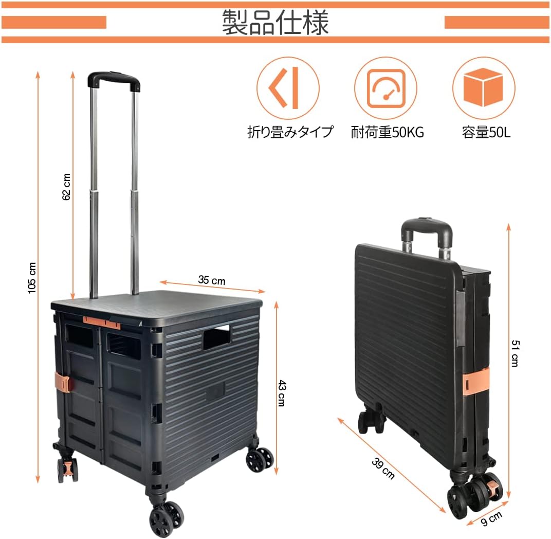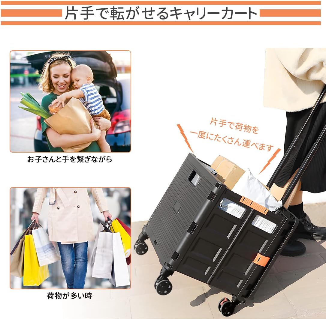 キャリーカート 折りたたみ 大容量50L ショッピングカート 4輪自在 耐荷重50KG キャスター ストッパー付き コンパクト ふた付き 買い物カート ブラック 台車 折り畳み式 釣り 運 アウトドア