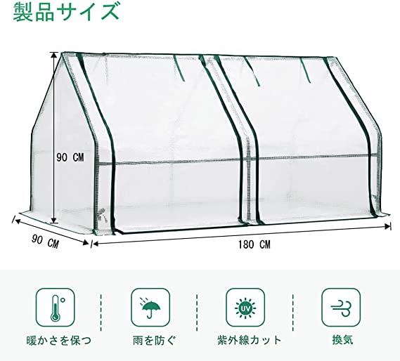 【多機能】ビニール ハウスは種子栽培、ぶどう栽培、苺の苗、野菜、花卉などに最適です。寒さと嵐、雨、霜、強い日差しの天候に対する保護します。長さ180cm 幅90 高さ90cm。内部にはフラワースタンドやプランターボックスも配置できます。