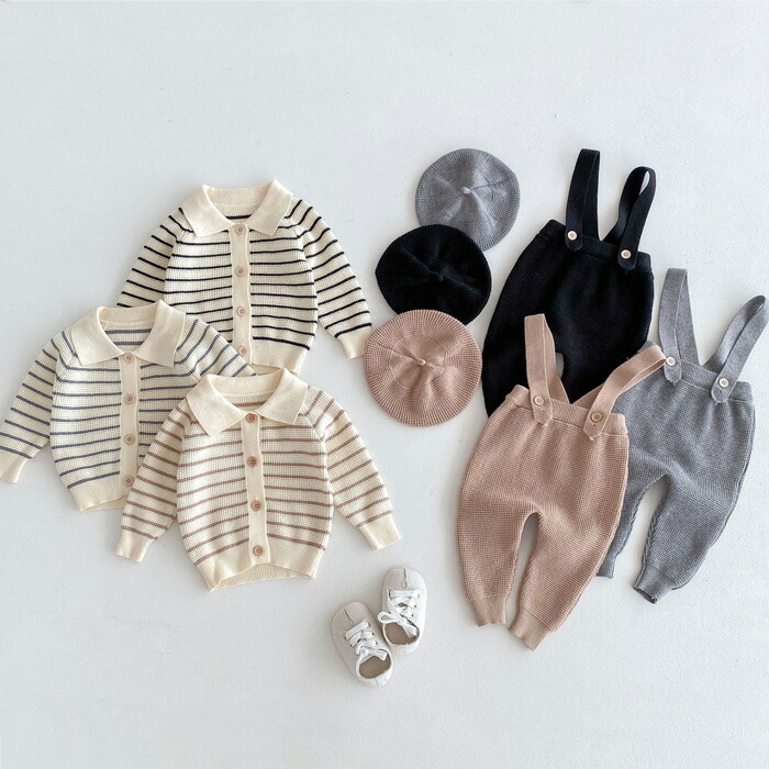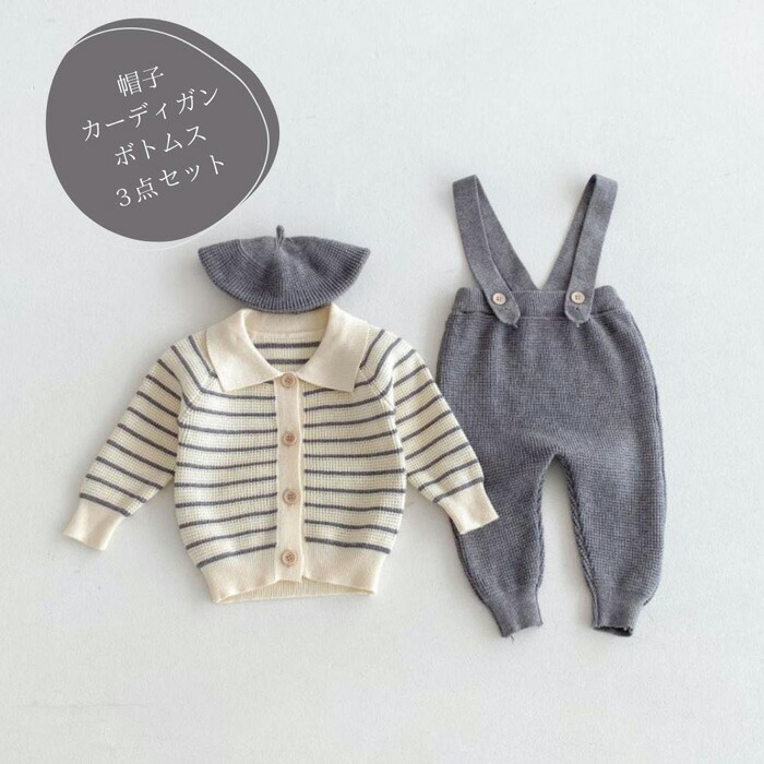 3点セット ニットカーディガン&サロペット ベレー帽 上下セット キッズ ベビー服 ニット セーター 長袖 トップス ボーダー ユニセックス 秋冬 子ども カーディガン セットアップ 66 7 パンツ