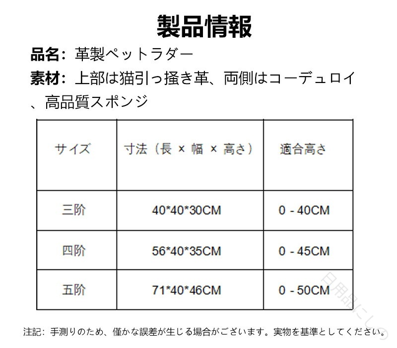 品名:革製ペットラダー素材:上部は猫引っ掻き革、両側はコーデュロイ、高品質スポンジ注意事項モデル画像は環境光の影響によりカラーが異なって見える場合がございます。採寸は製造メーカー提供情報ですので、1~3cm誤差が生じる場合がございます。イメージ違いサイズ感での御返品にはお応え出来ません。以上の点を予めご了承下さい。【品質保証サービス】弊店はお客様に安心なサービスを提供しております。開封後の商品や、ご洗濯後の商品など、製品の品質の問題であれば、ご利用いただいてからのご変更や交換も対応しておりますので、ご安心ください。【注意事項】製品更新により、予告なしで同じ商品がデザイン、色若干変わる場合がございますので、予めご了承下さい。撮影の為、画質等の関係上、色などが実際の商品と若干違ってしまうこともあるかもしれませんがご理解のほどご購入ください。予めご了承ください。更新のタイミングによっては実在庫に相違が出る場合がございます。万が一商品に不具合がある場合は、無償交換返金は可能です。マイナス評価する前にご遠慮なく当店と連絡してください。