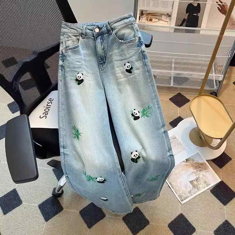 レディース ファッション カジュアル おしゃれ 大きいサイズ 刺繍 パンダ ストレート ジーンズ 春夏 スリム ワイドレッグ パンツ ハイウエスト