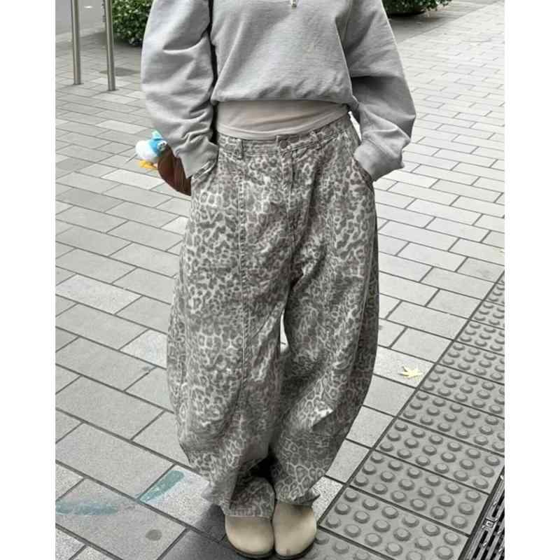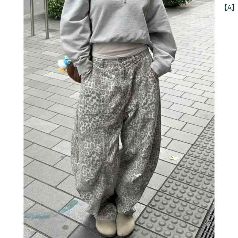 デニムパンツ メンズ アメリカンヴィンテージ風 アメカジ ヒョウ柄 ルーズフィット ワイドシルエット ストレート フルレングス コットン カジュアル ストリートファッション 普段使い 再生繊維