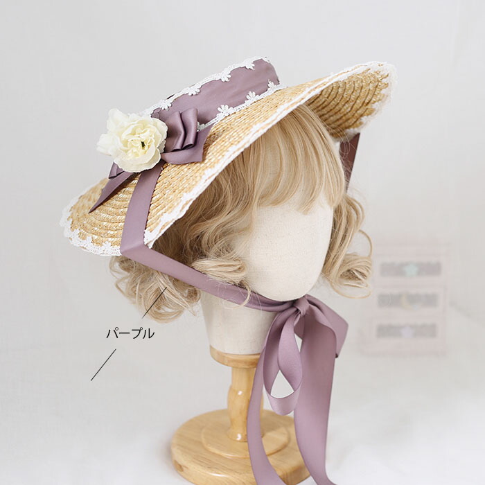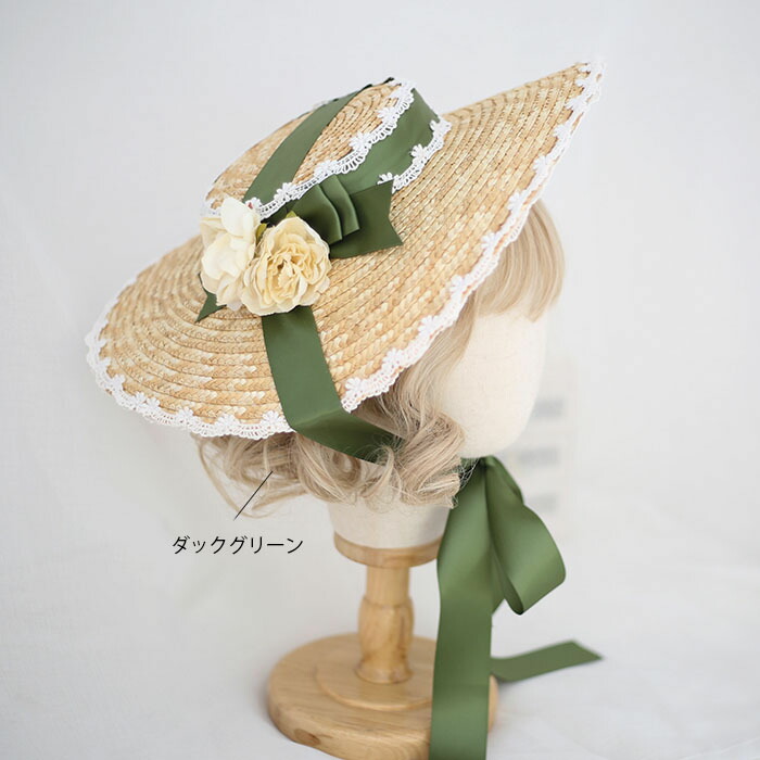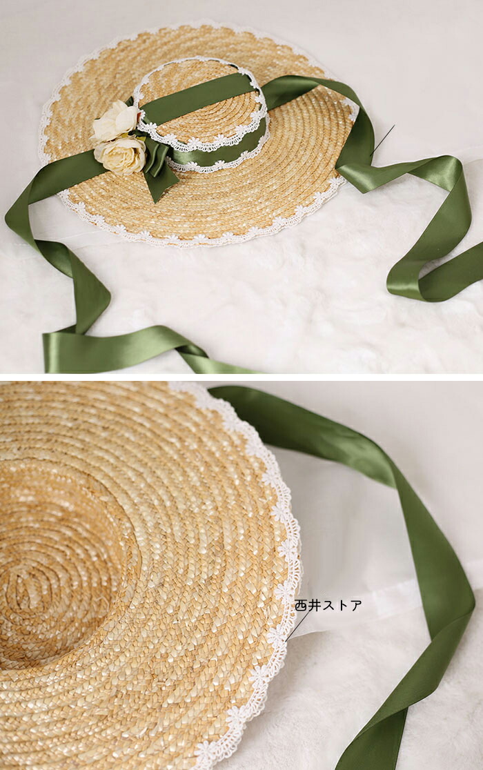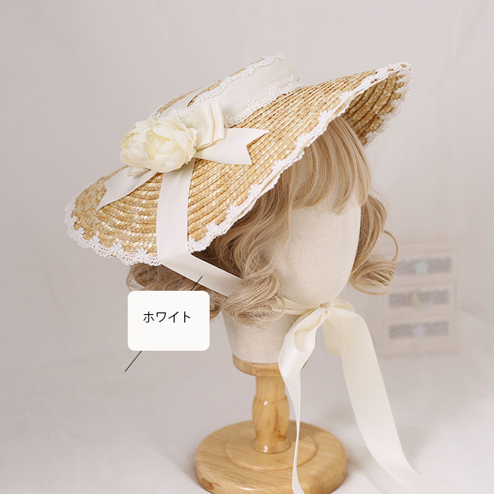 レースリボン ストローハット 麦わら帽子 つば広 レディース コサージュ 可愛い レース ゴスロリ