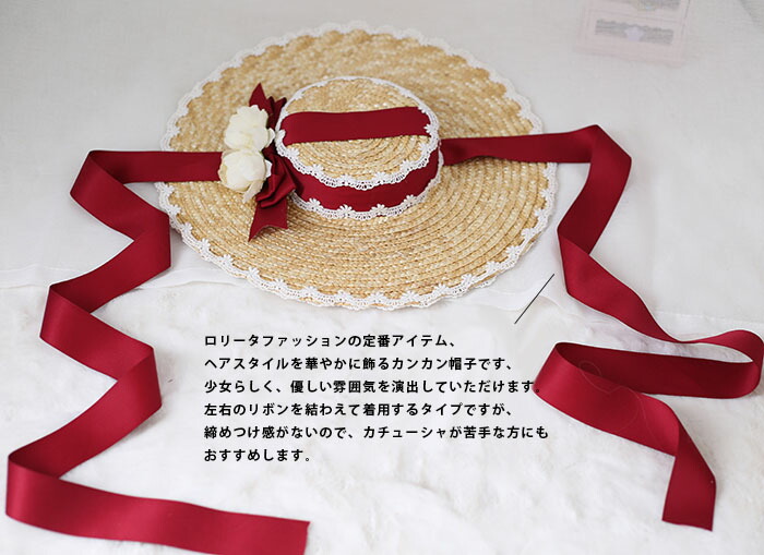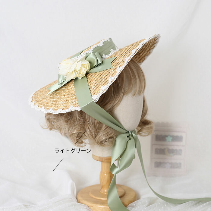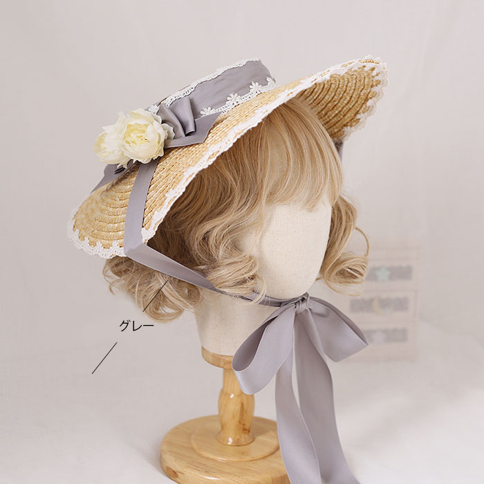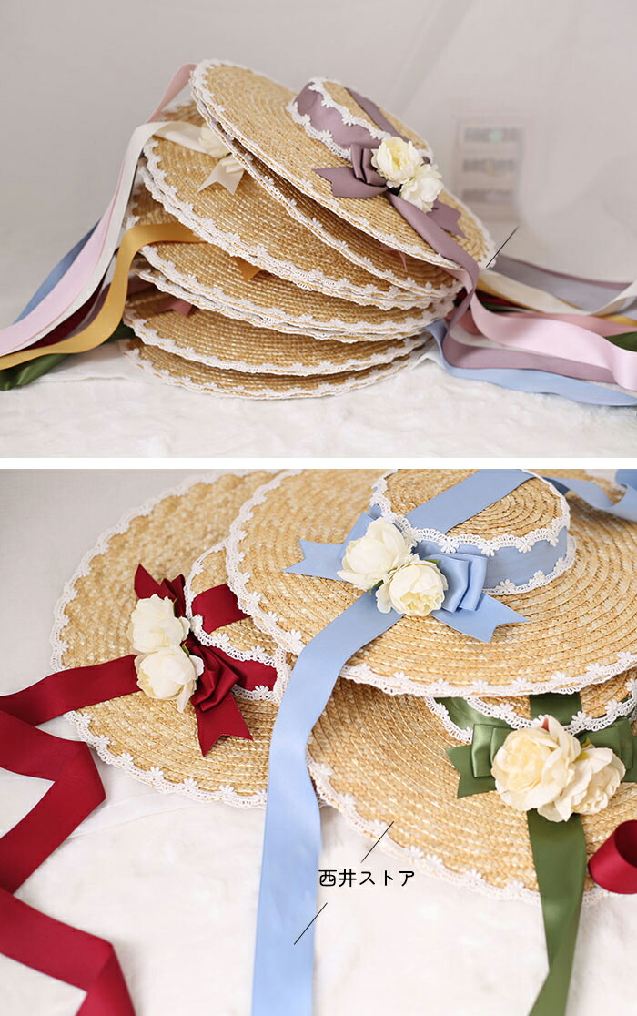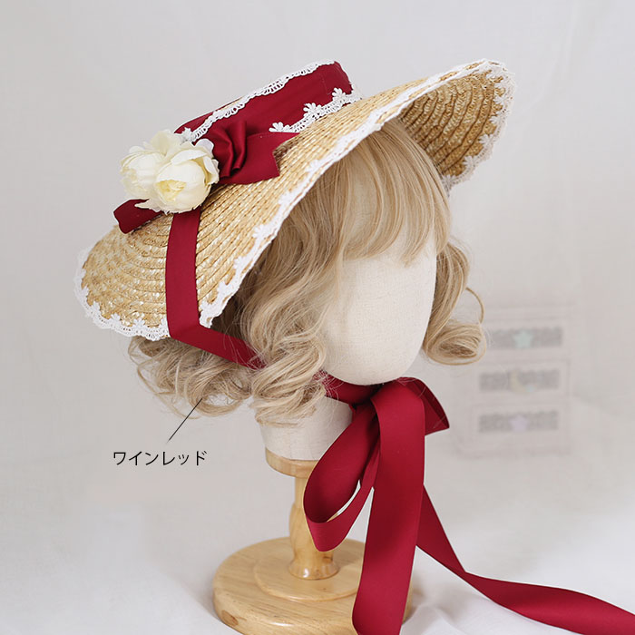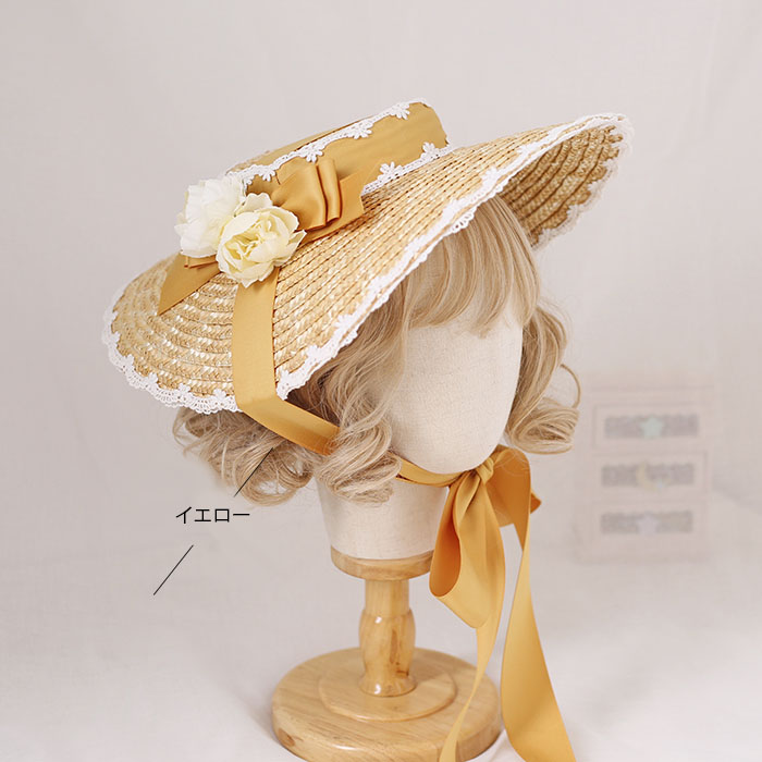 ヘッドドレス カンカン帽 帽子 ハット 麦わら帽子 レース リボン 顎リボンつき